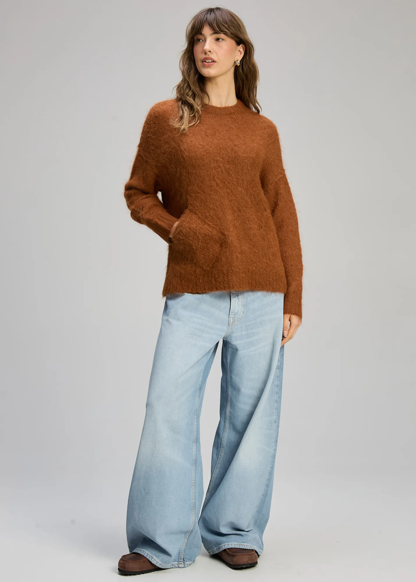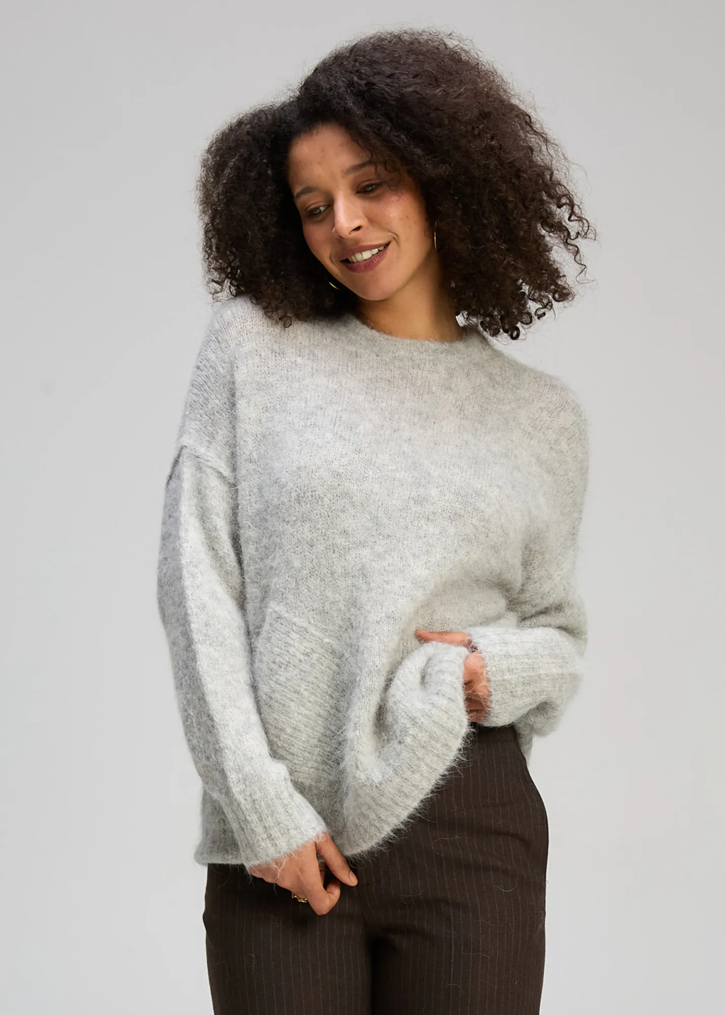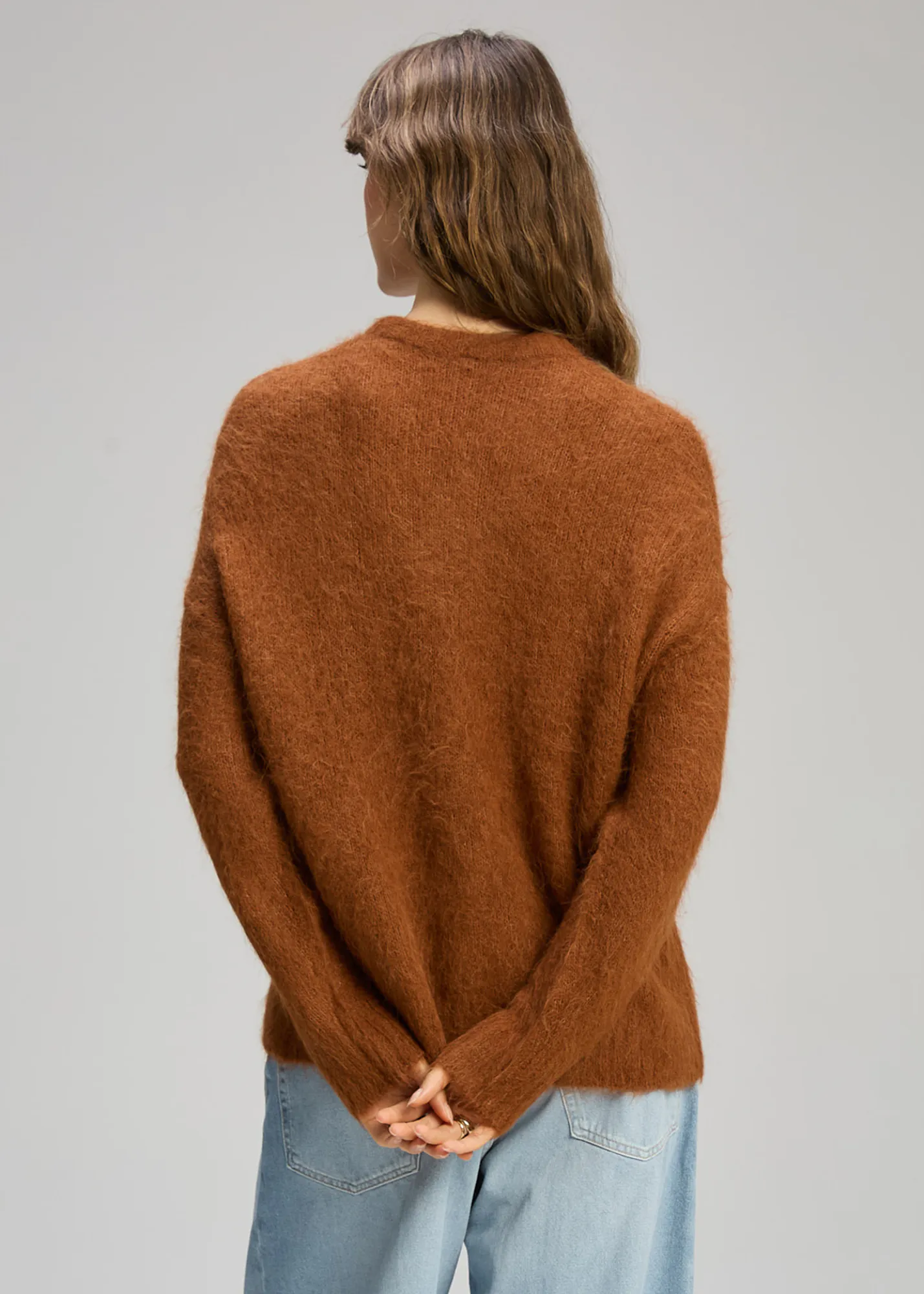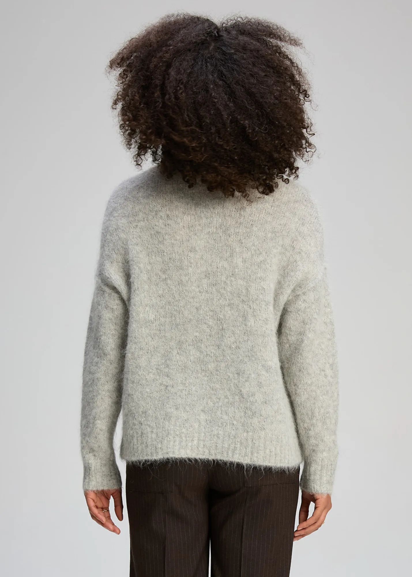 Crafted from a luxurious alpaca blend, it offers a gentle, breathable warmth and a refined drape. The relaxed silhouette sits comfortably on the body, making it easy to wear on its own or layered under coats and jackets. It’s a timeless knit that feels both cosy and polished.