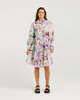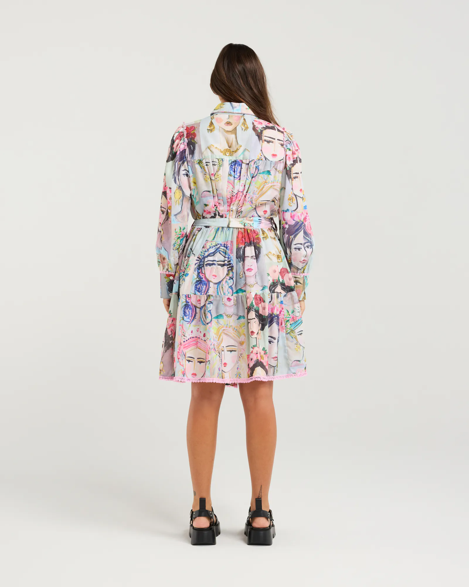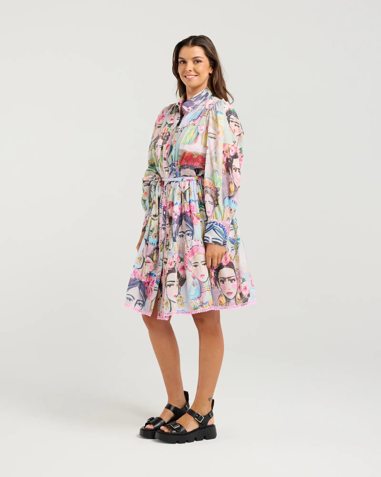 A statement shirt dress with a Frida Carlo inspired print. Finished with contrast trim, button down front and a self tie waist for an expressive look.
