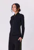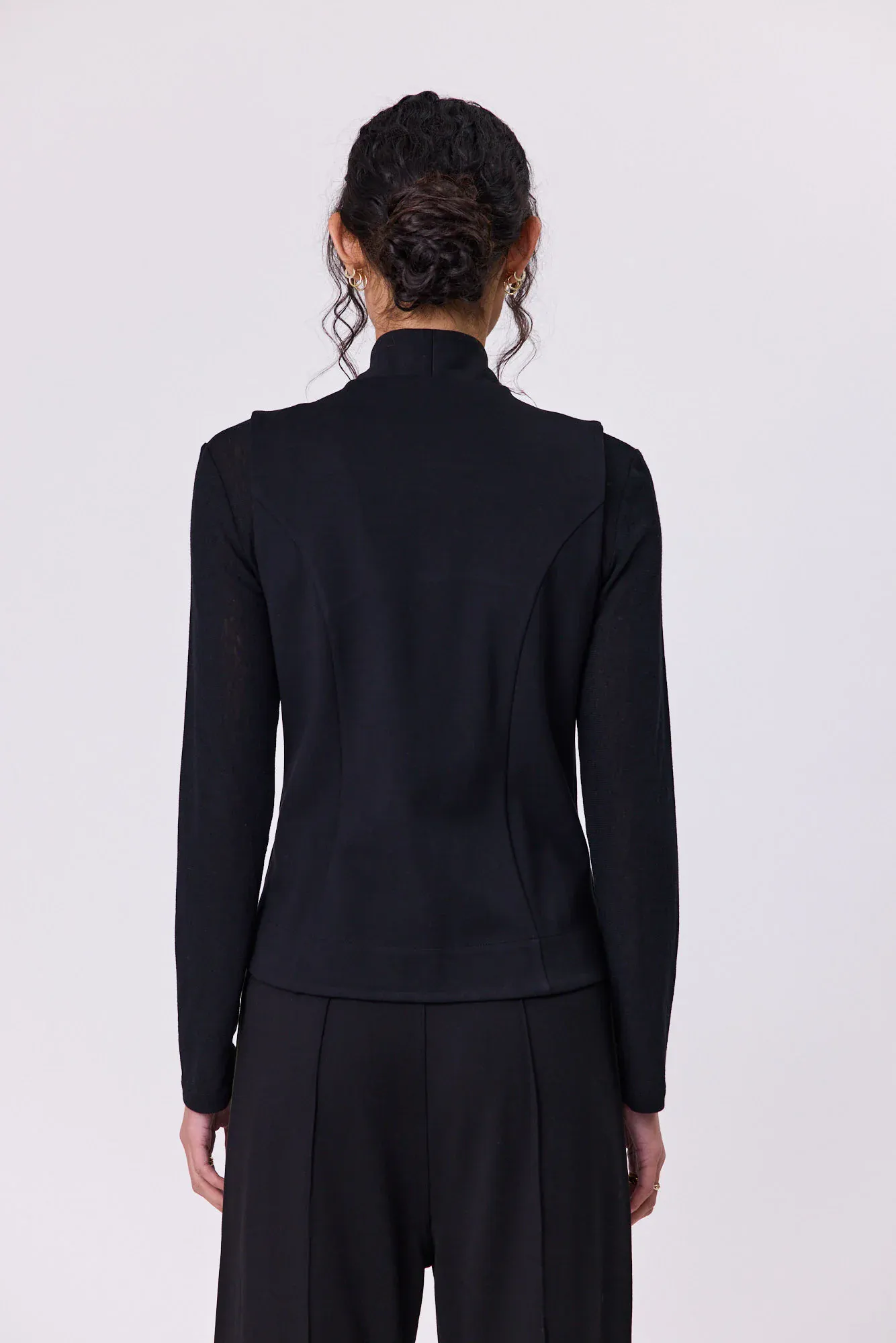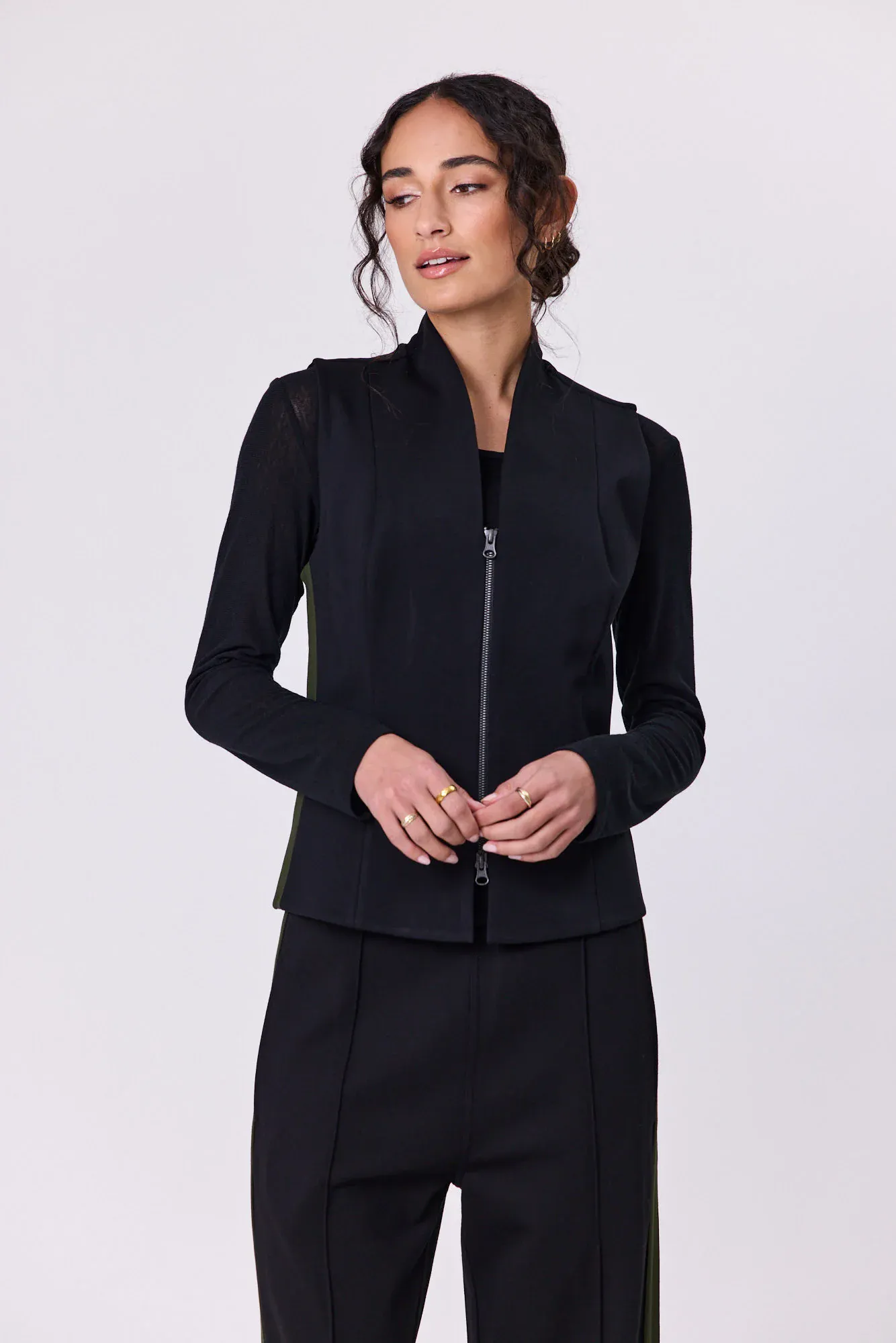 The contoured neckline frames the collarbone before falling into an elongated V neck, creating a flattering lengthening effect. The two way zip allows you adjust the fit to create different looks, wear it fully zipped for a polished finish, partially open, or unzipped for a relaxed vibe.
