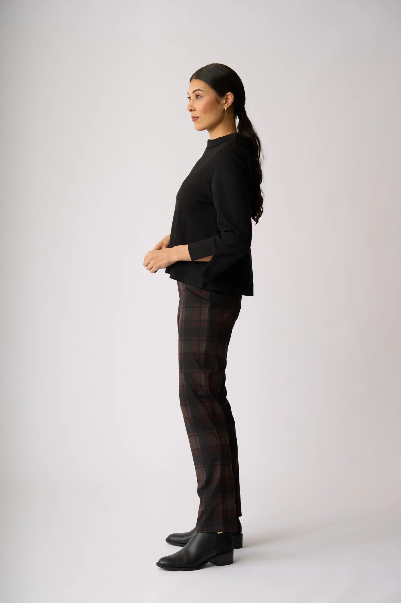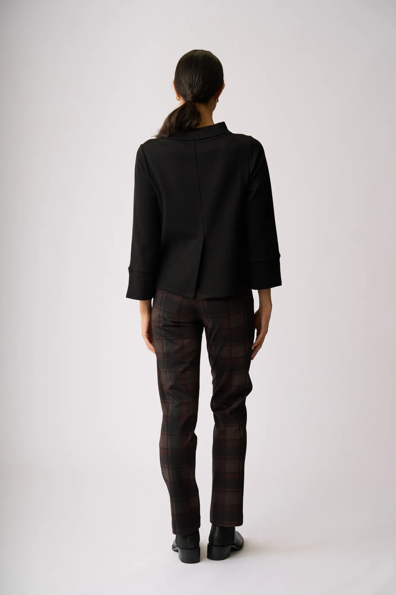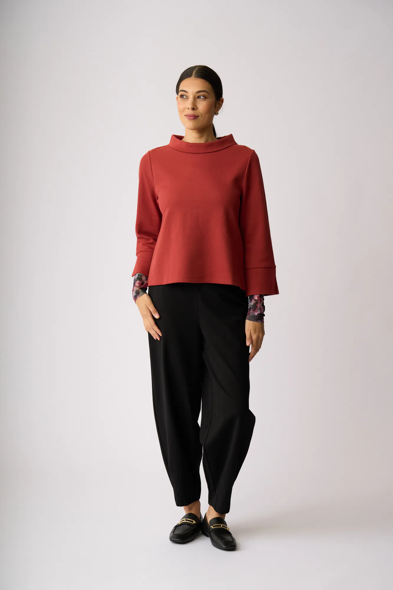 Boat neck and splits to the 3/4 sleeve cuffs