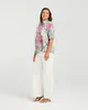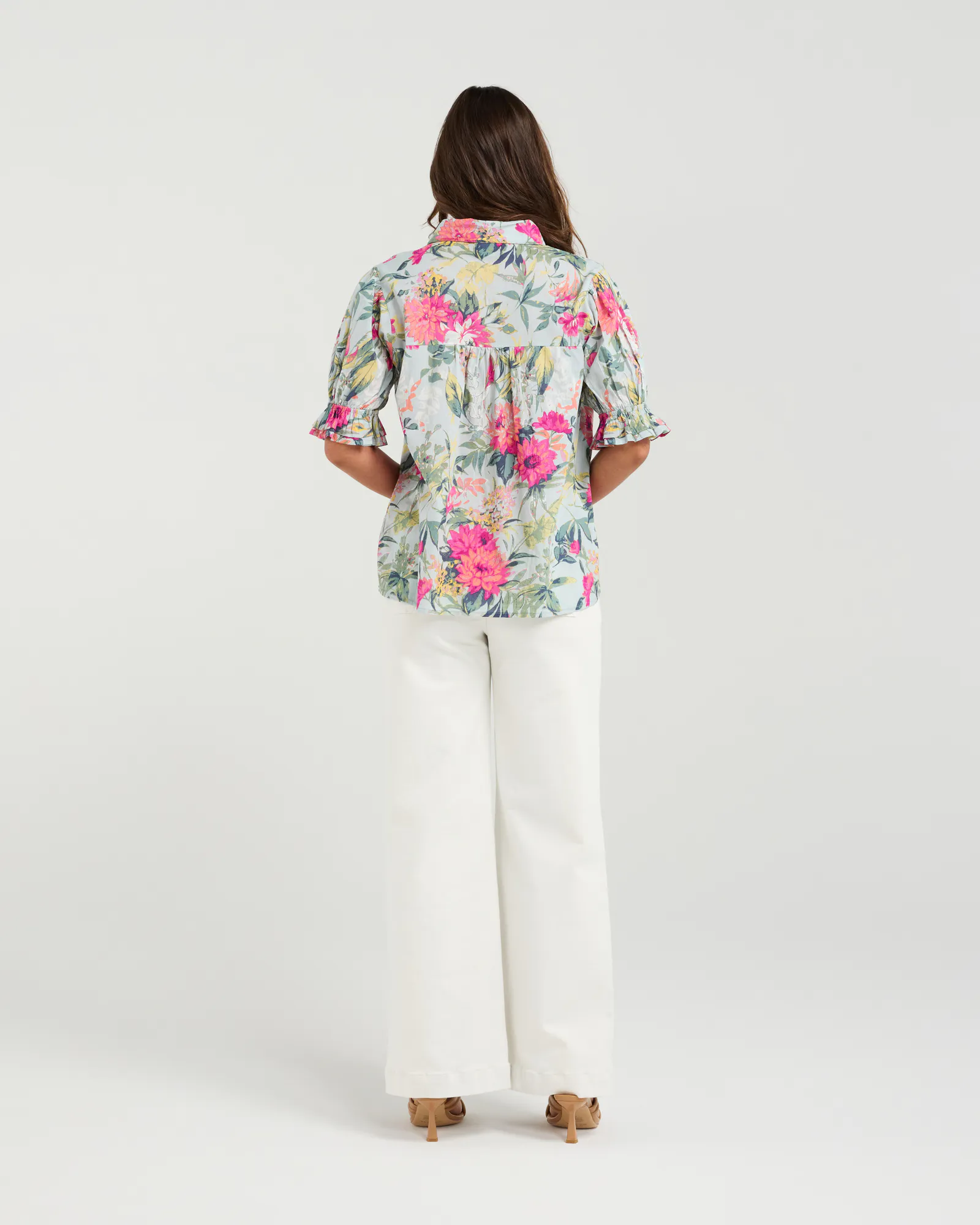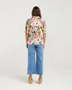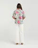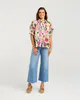 This blouse features a lush bontanical print. The piece has a relaxed silhouette with a classic collared neckline and pink pearlescent buttons. Puff sleeves with a gathered cuffs bring a playful, romantic flair.