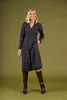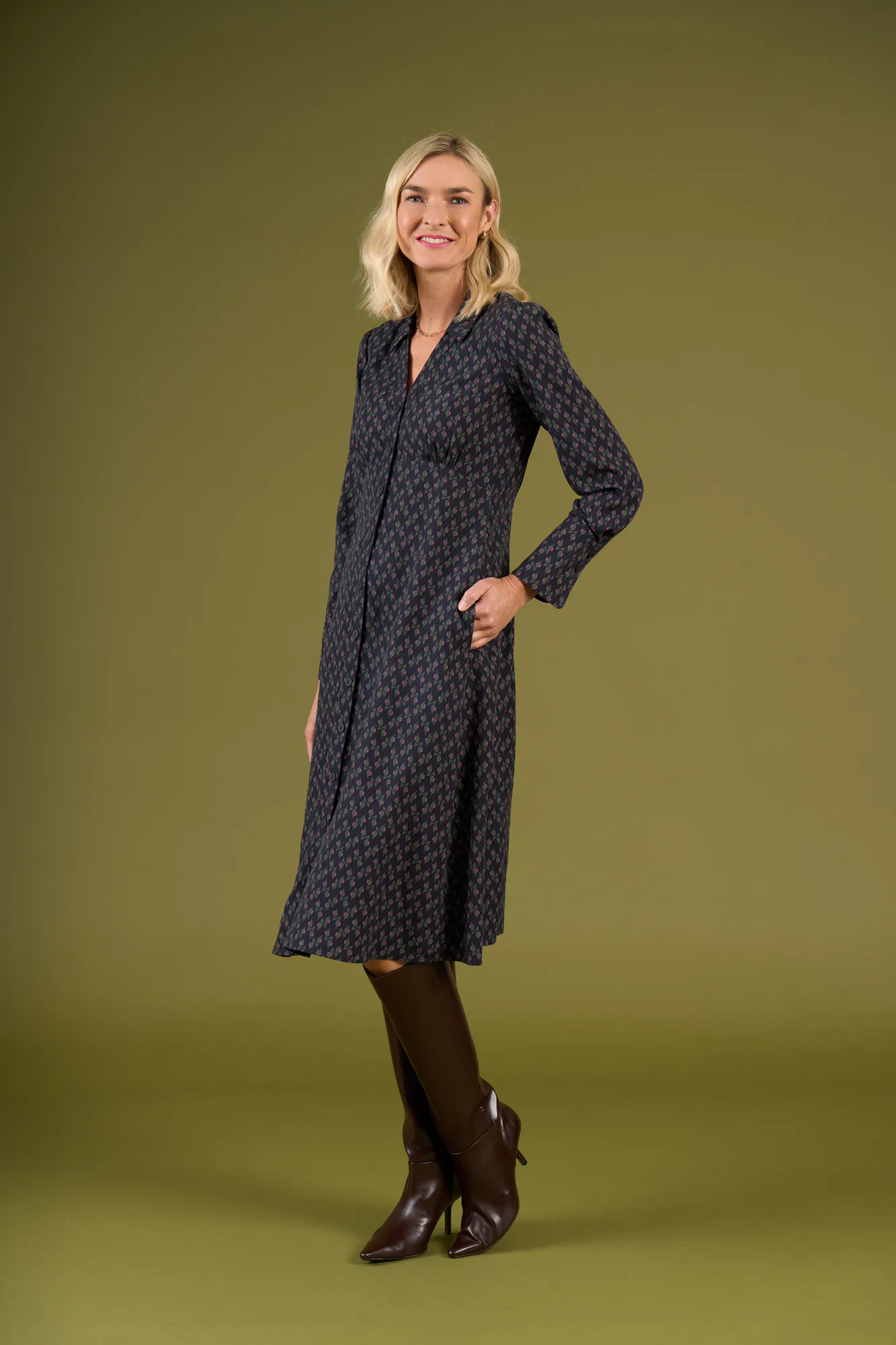 The Britomart dress is a long sleeve midi shirt dress with a v neckline. It flatters the body with gathers at the bust and waist and then flares in the skirt. Body length from shoulder to hem is approx. 116.5cm (Size 10).