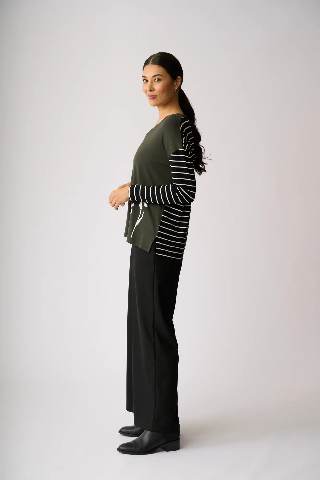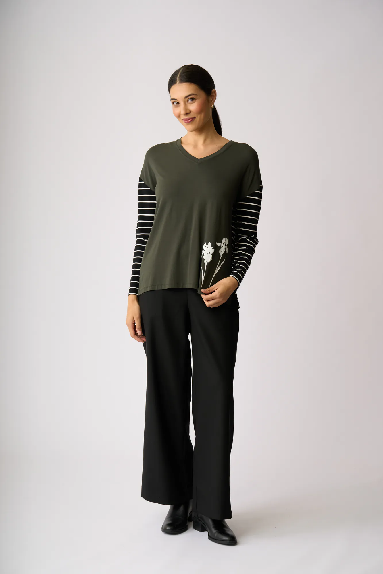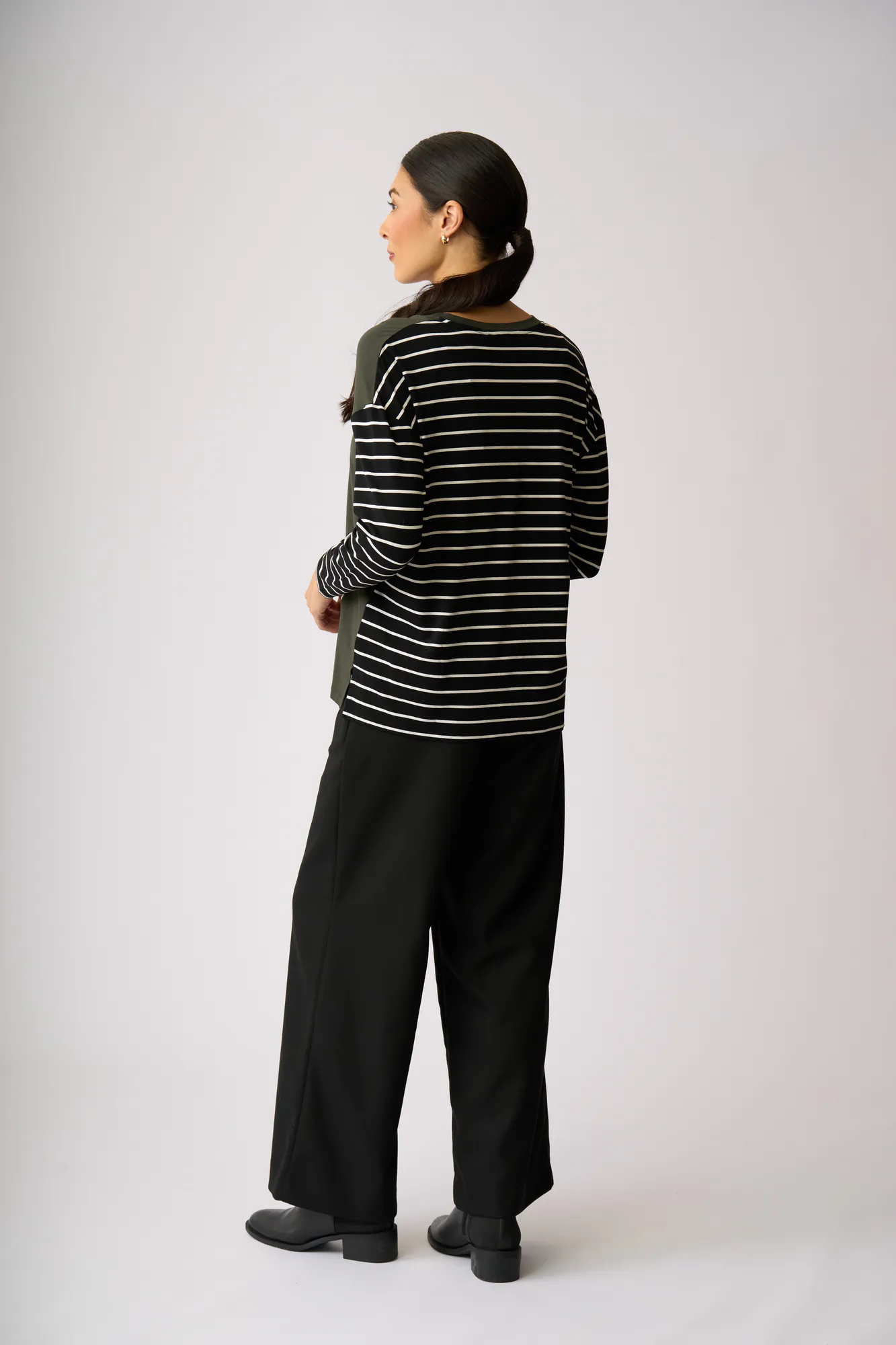 Combo print top featuring a plain front body with stripe detail on the back body and sleeves