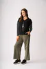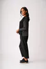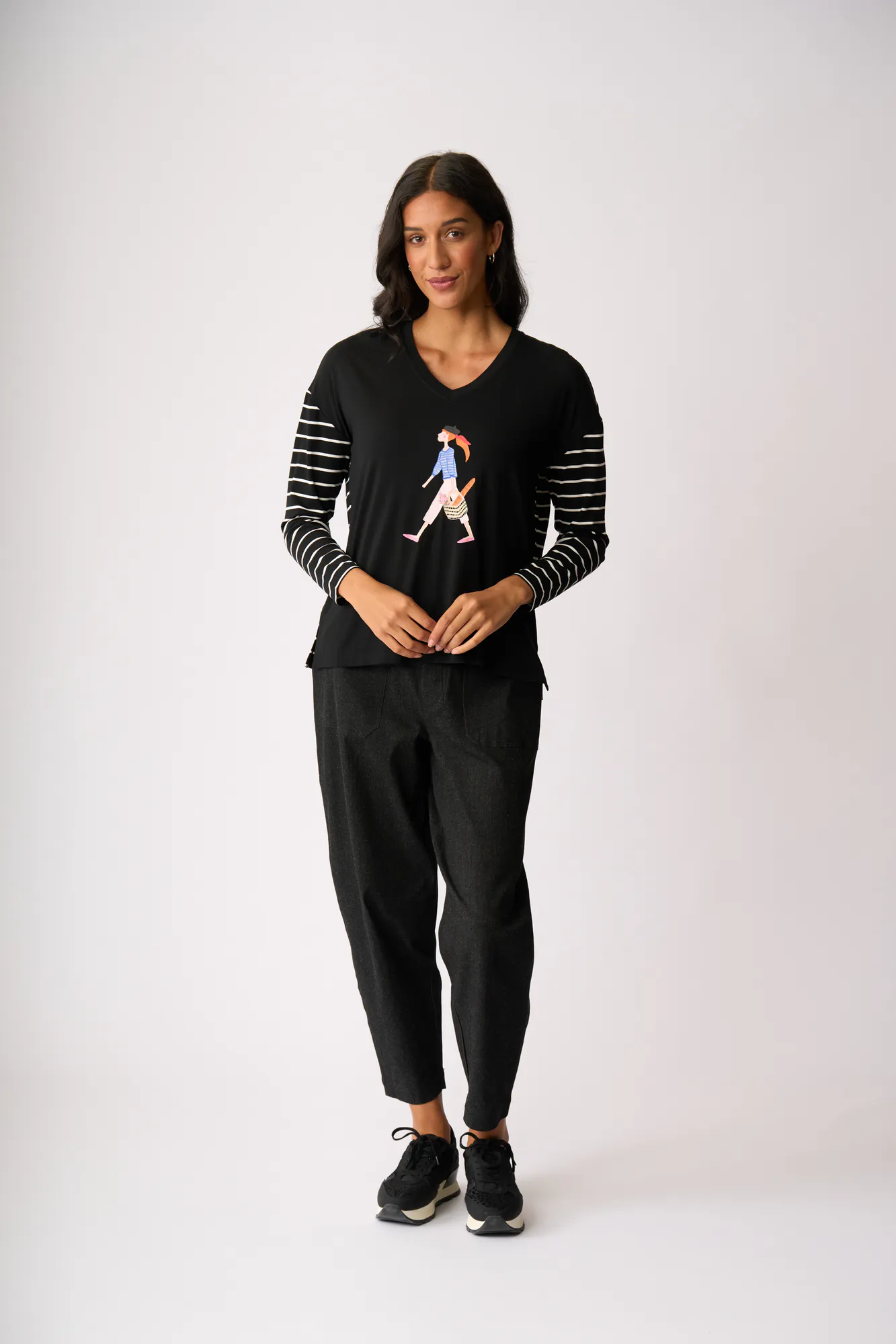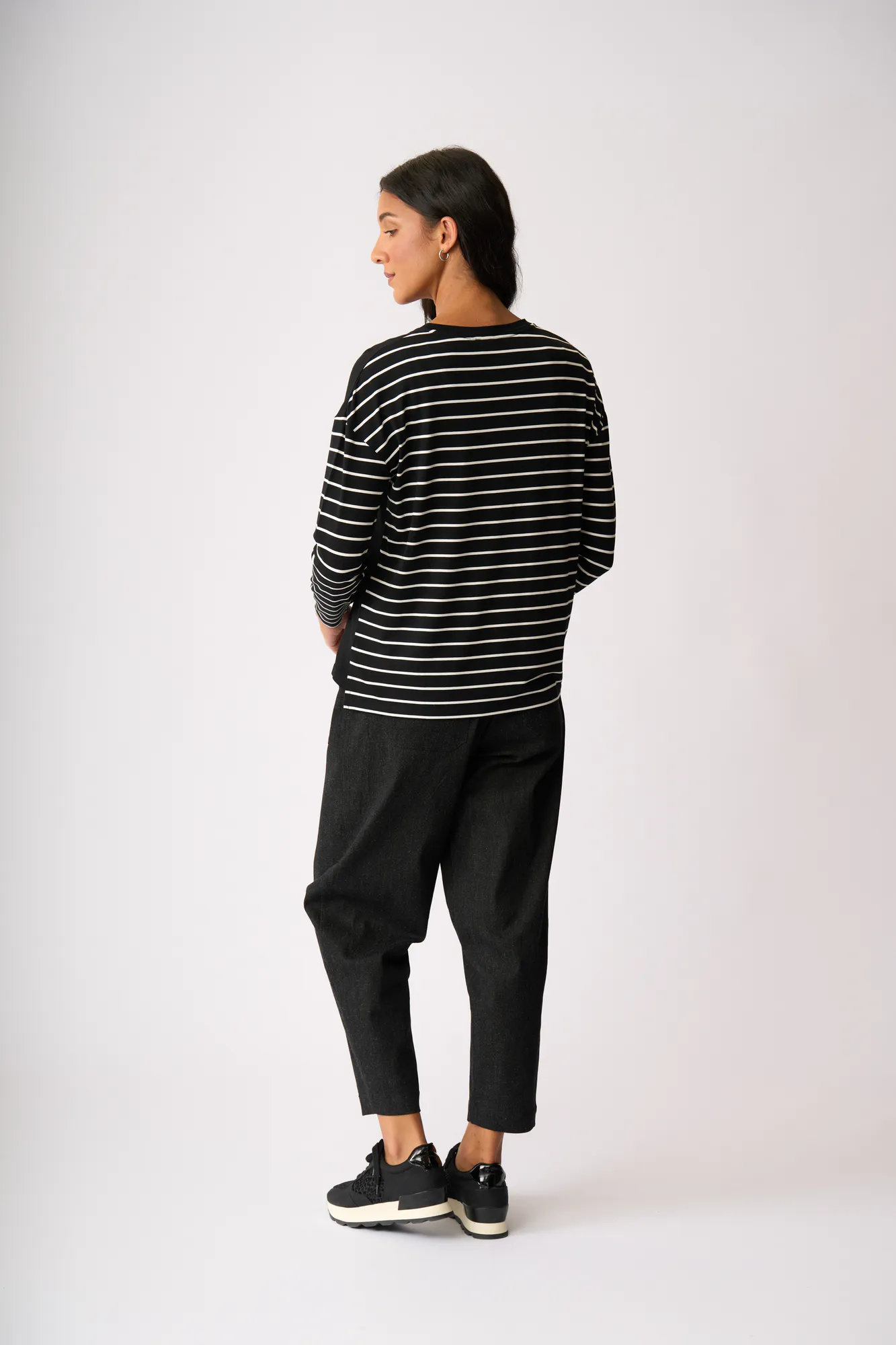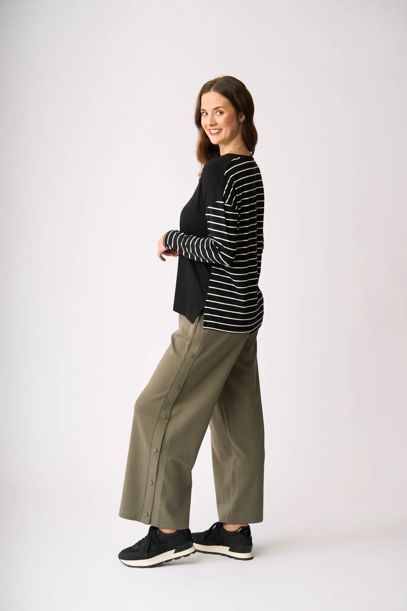 Combo print top featuring a plain front body with stripe detail on the back body and sleeves