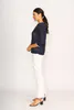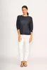 A loose fit knit top with 3/4 sleeves and ribbed cuffs and hem. This style has contrast roll trim at the neck, cuffs & hem. Body length from shoulder to hem is approx. 58cm (size M).