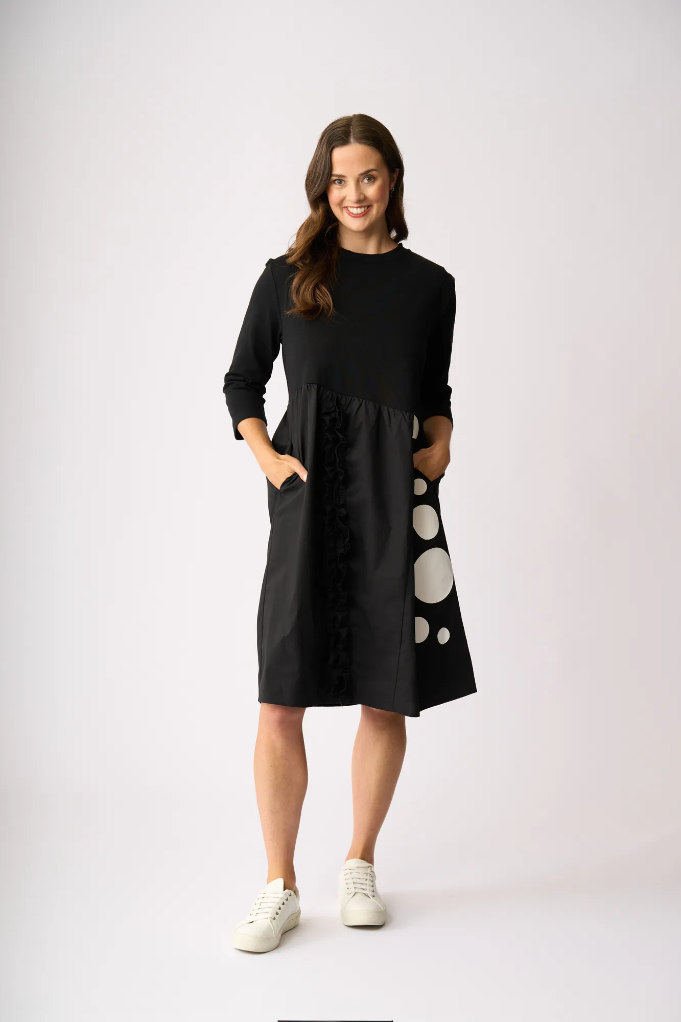 Both woven and knit fabric, frills and a spot screen print