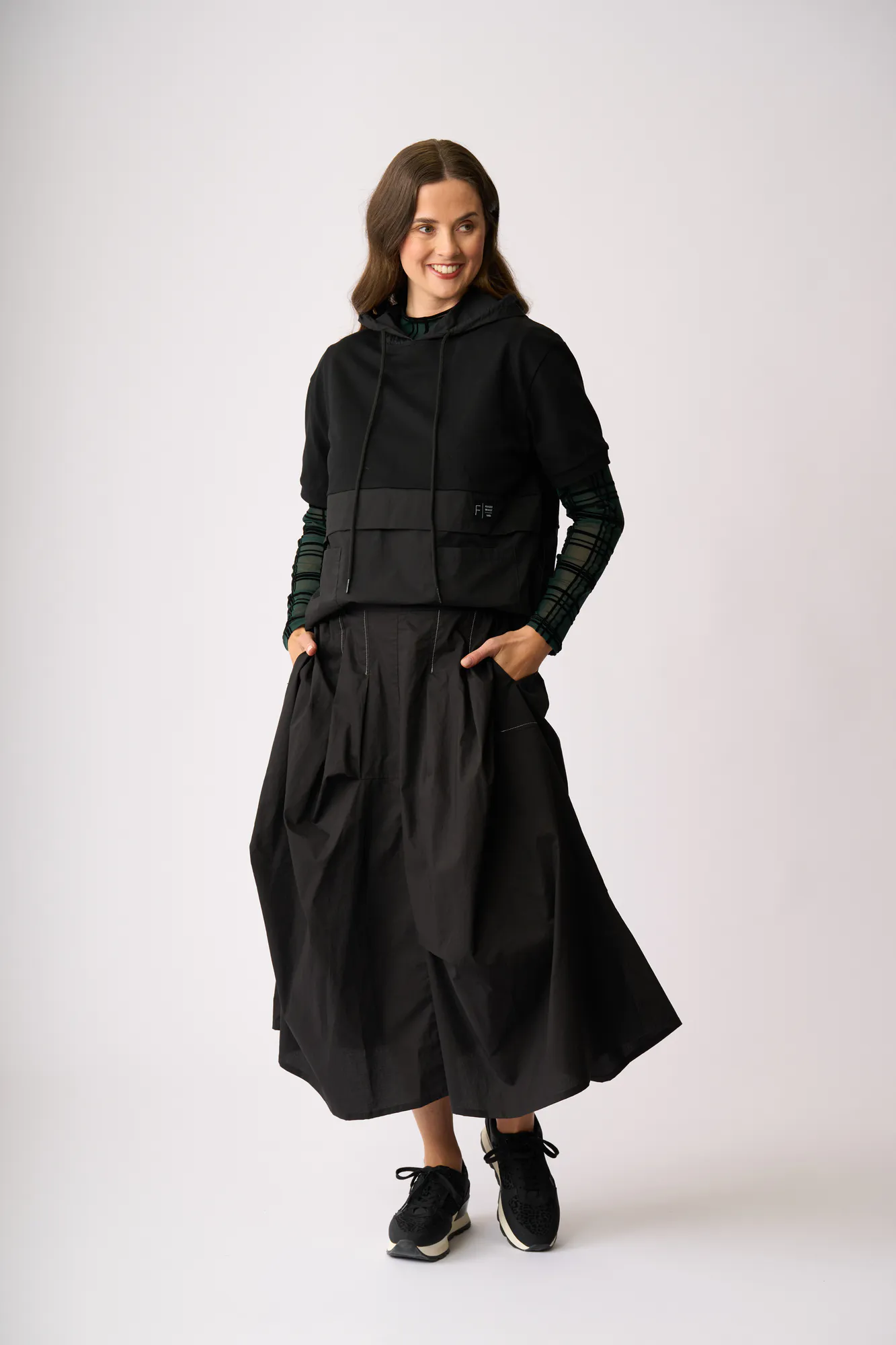 Drop shoulder and side seam drawcord to customize the fit