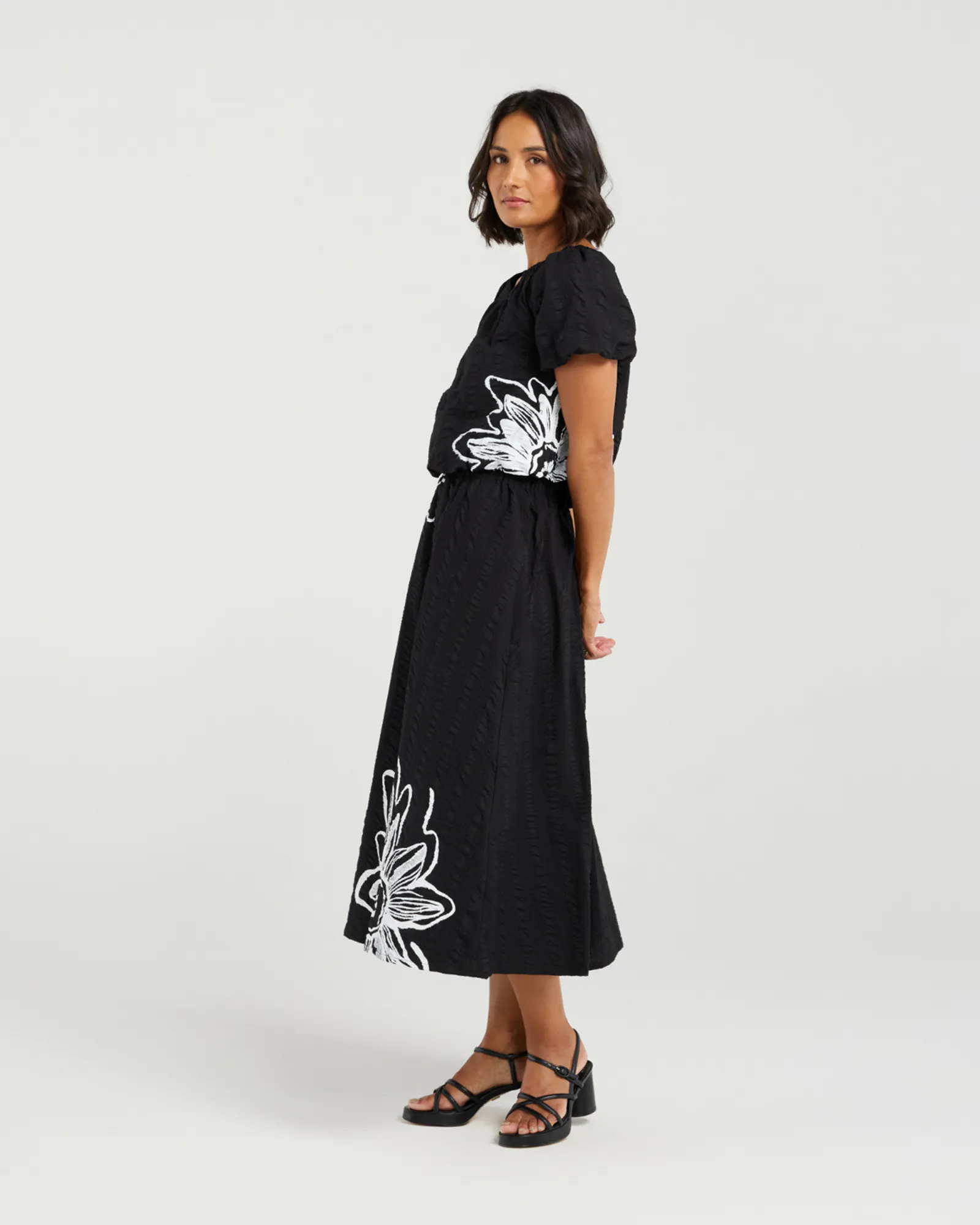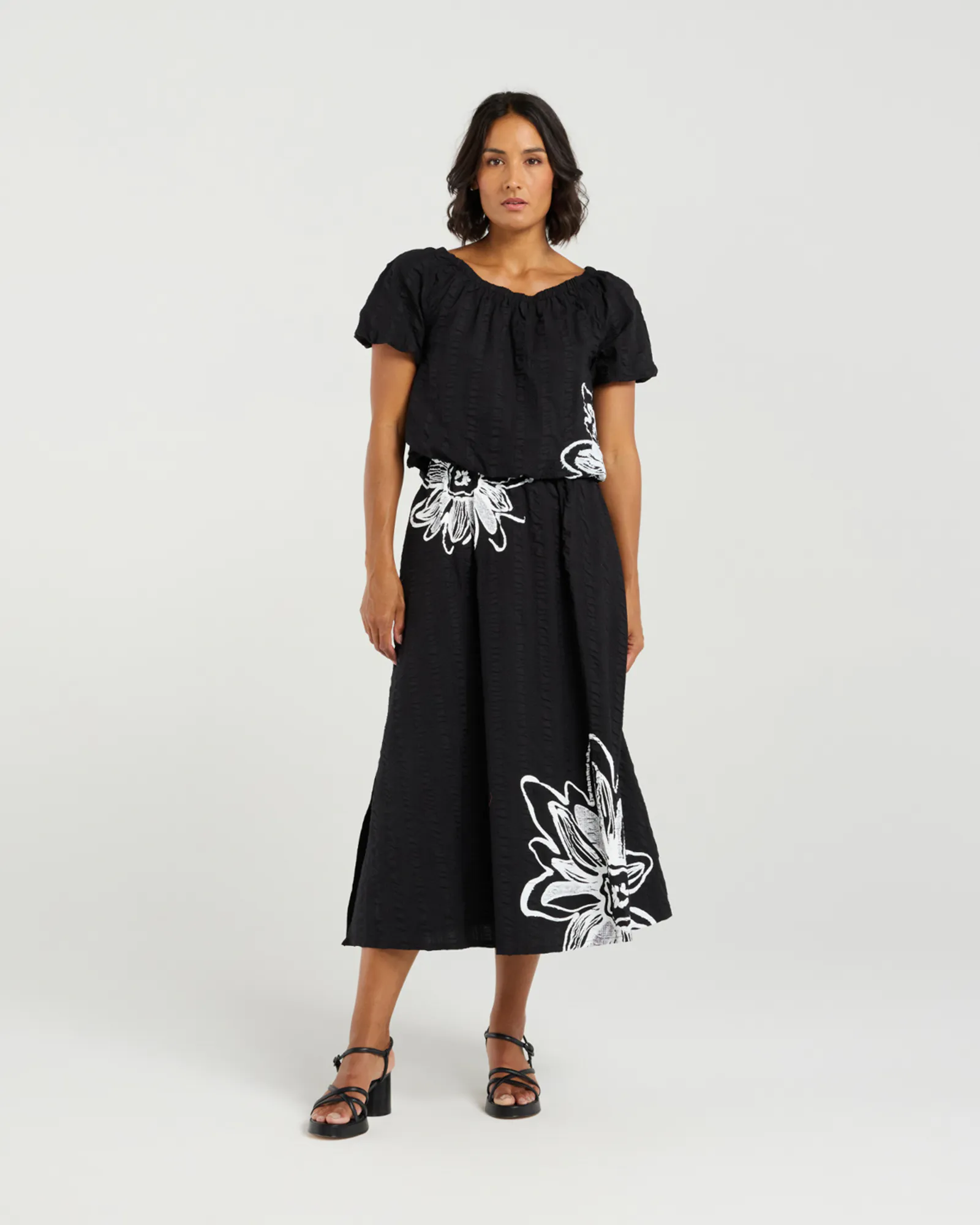 Playful yet polished, this A-line skirt is designed in a breezy silhouette with an easy elastic waistband for all-day comfort. Featuring a strong daisy print and a single side split for a hint of movement and edge, it’s the perfect piece to take you from sunny strolls to casual evenings with effortless style. Pair with the Daisy Crop for a perfect all in one summer outfit.