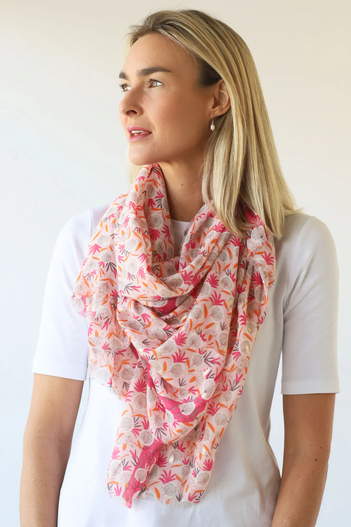 The vibrant pinks and orange colour palette and whimsical dandelion design make it a standout accessory for both casual and dressy ensembles, while its generous size allows for versatile styling options.
