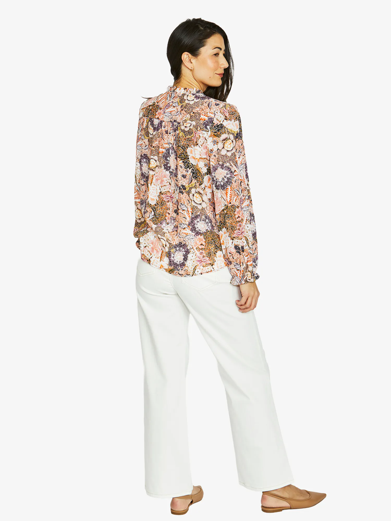Ruffle neck, split V neck top, Delicate paisley print - 100% viscose crepe