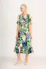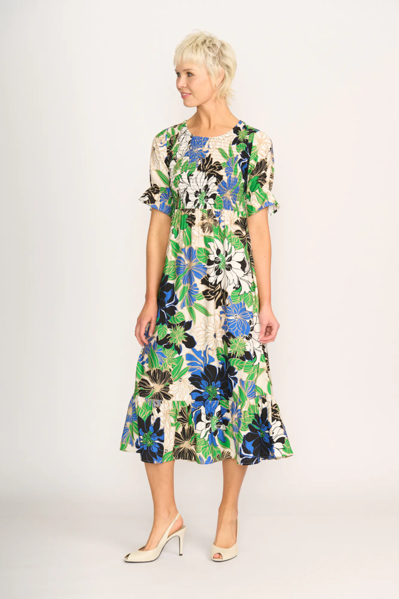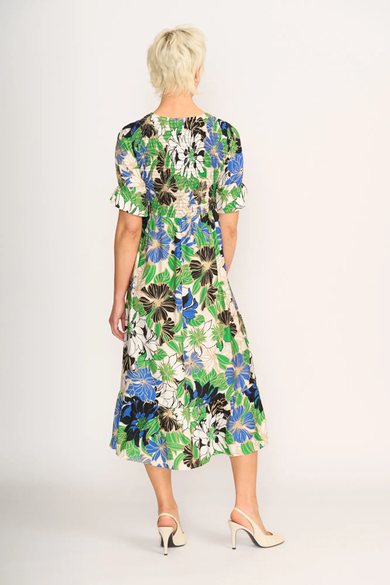 A midi length dress with a flattering a shirred bodice. Scoop neckline. Elasticated cuff to the elbow length sleeve. Body length taken at the centre front is approx. 130cm (size 12 )