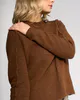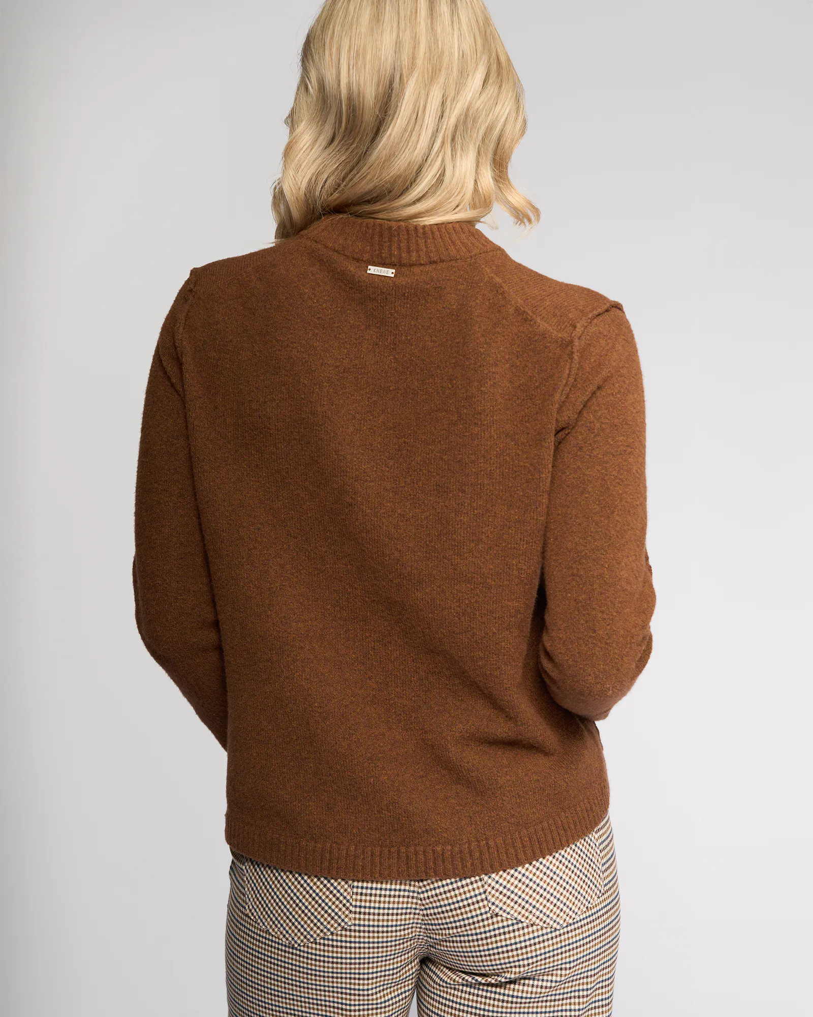 Cosy, stretchy knit sweater in Cedar, a warm, golden-brown colour. Featuring a round neckline and ribbed cuffs and hem, this sweater is defined by its exposed seam detailing along the shoulders, sleeves, and body.