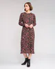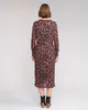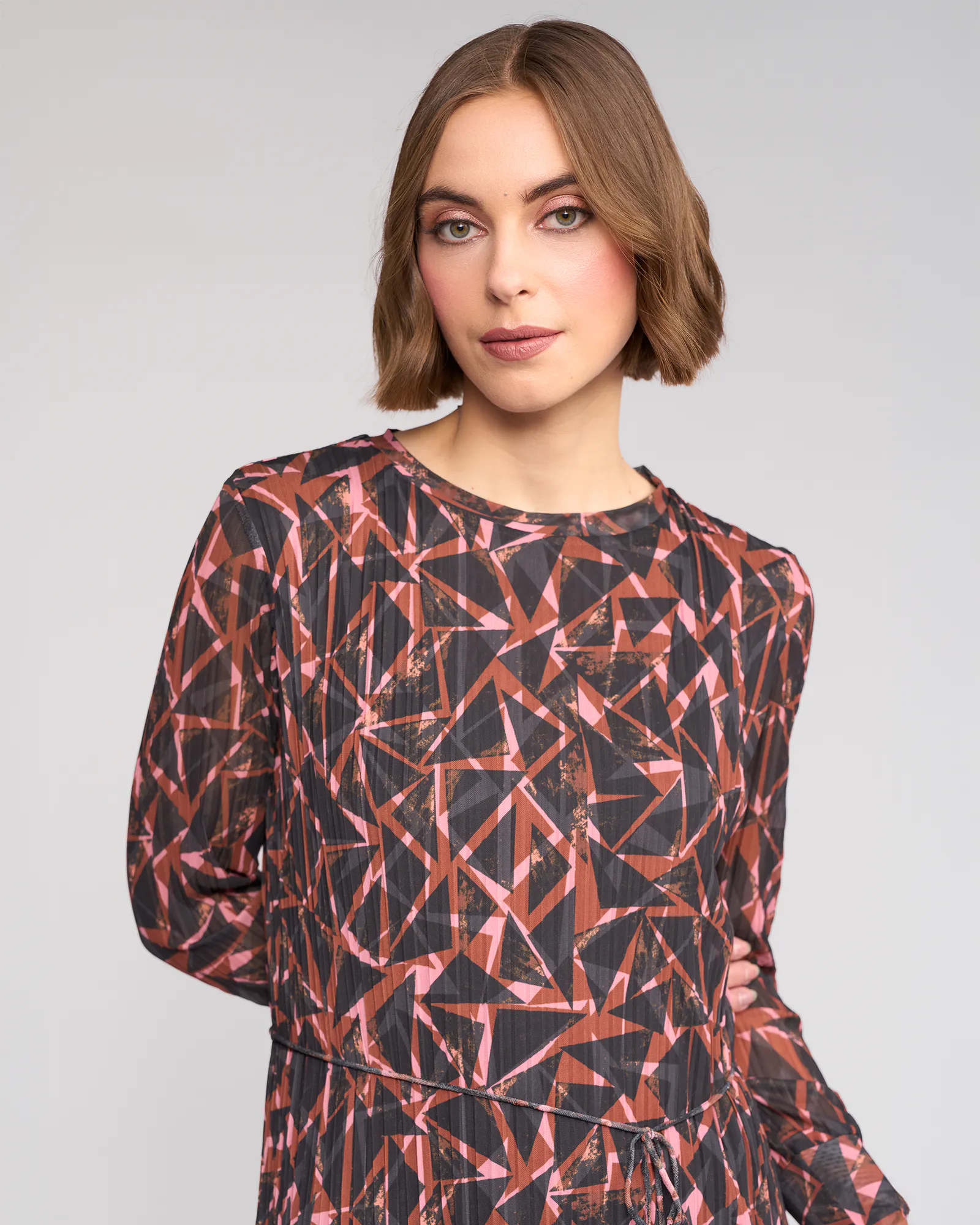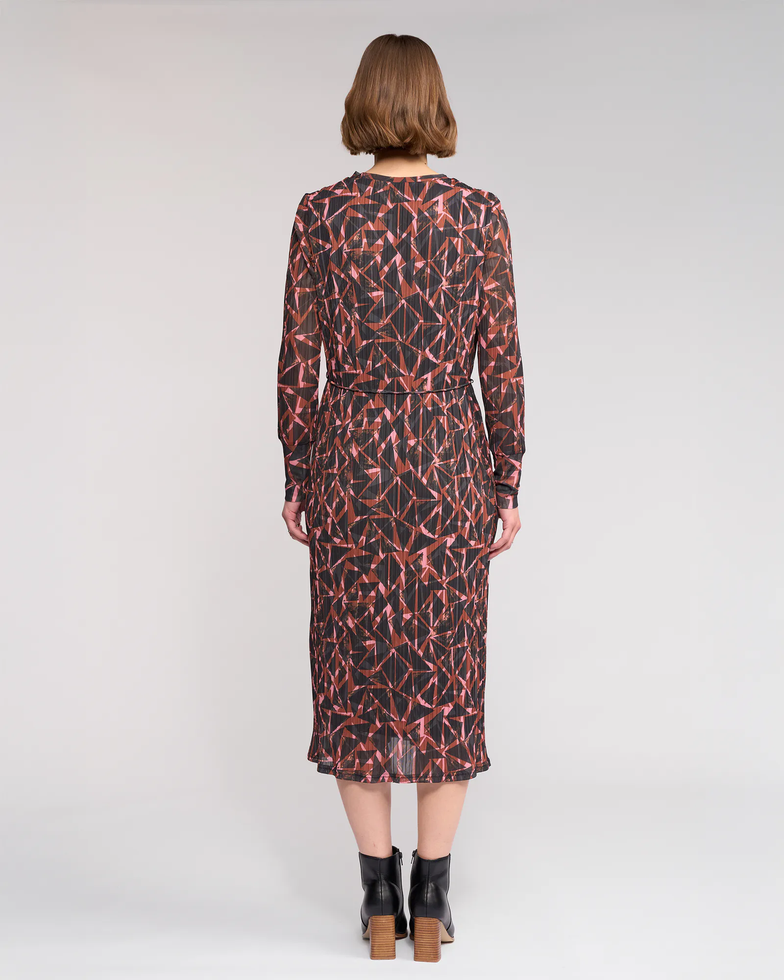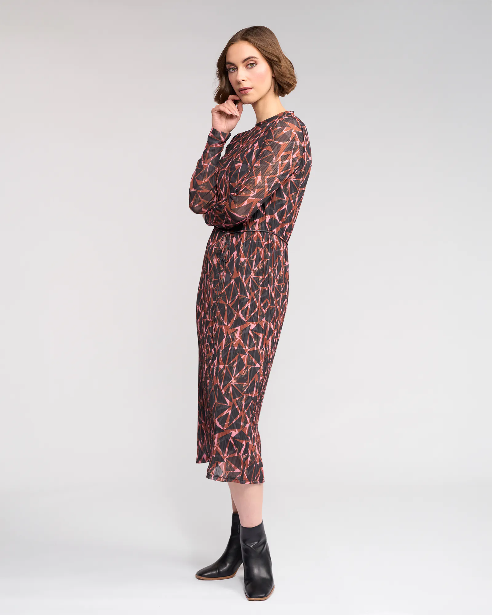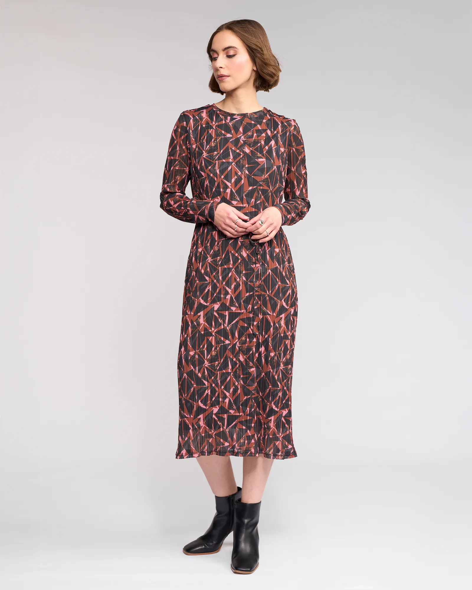 Long sleeve winter dress crafted from a stretchy crinkle mesh in the Dusk print, featuring a bronze base with black and soft pink geometric shapes. Designed with a slim fit silhouette, round neckline and a matching self fabric waist tie to define the waist, this dress offers an elevated yet effortless winter option.