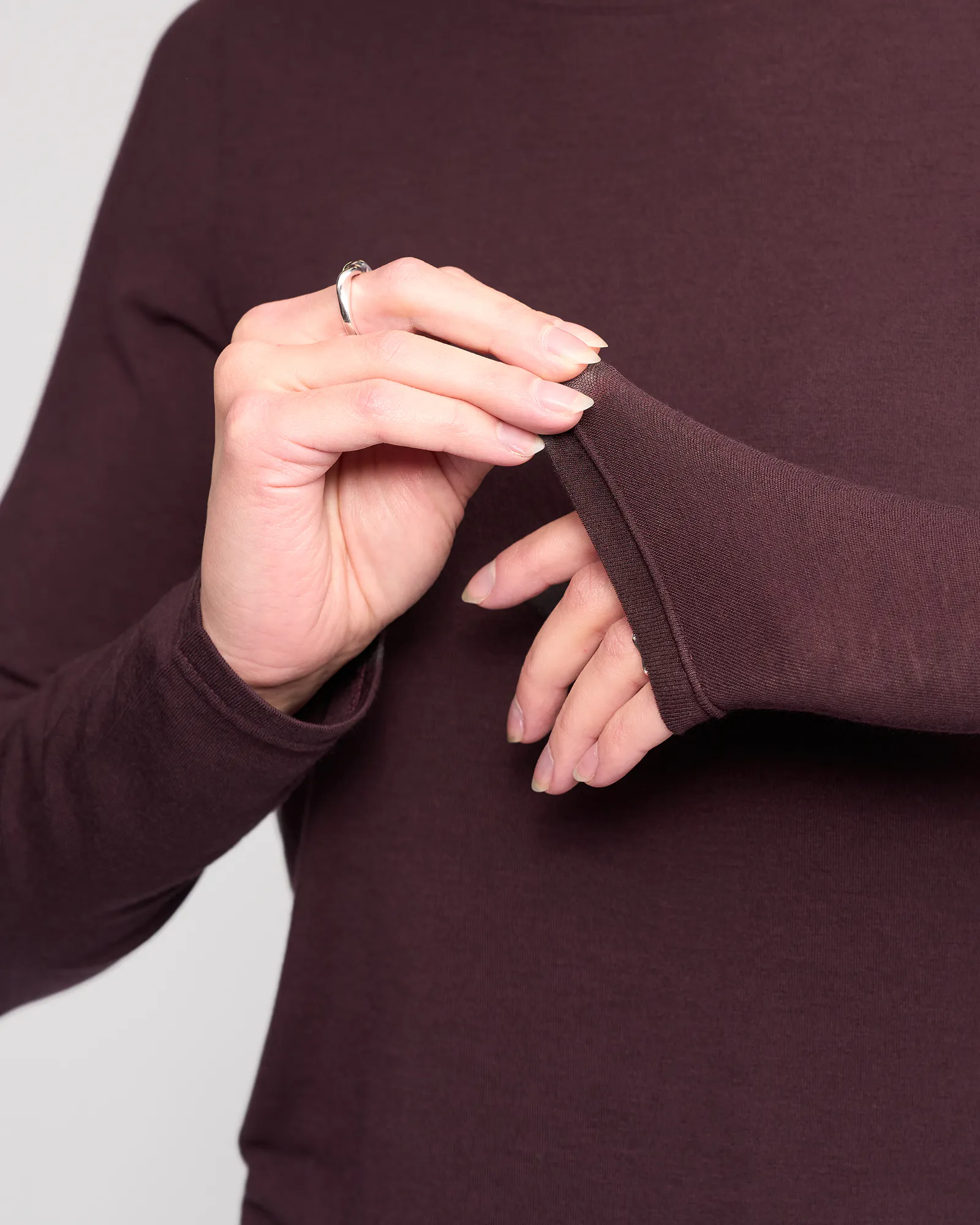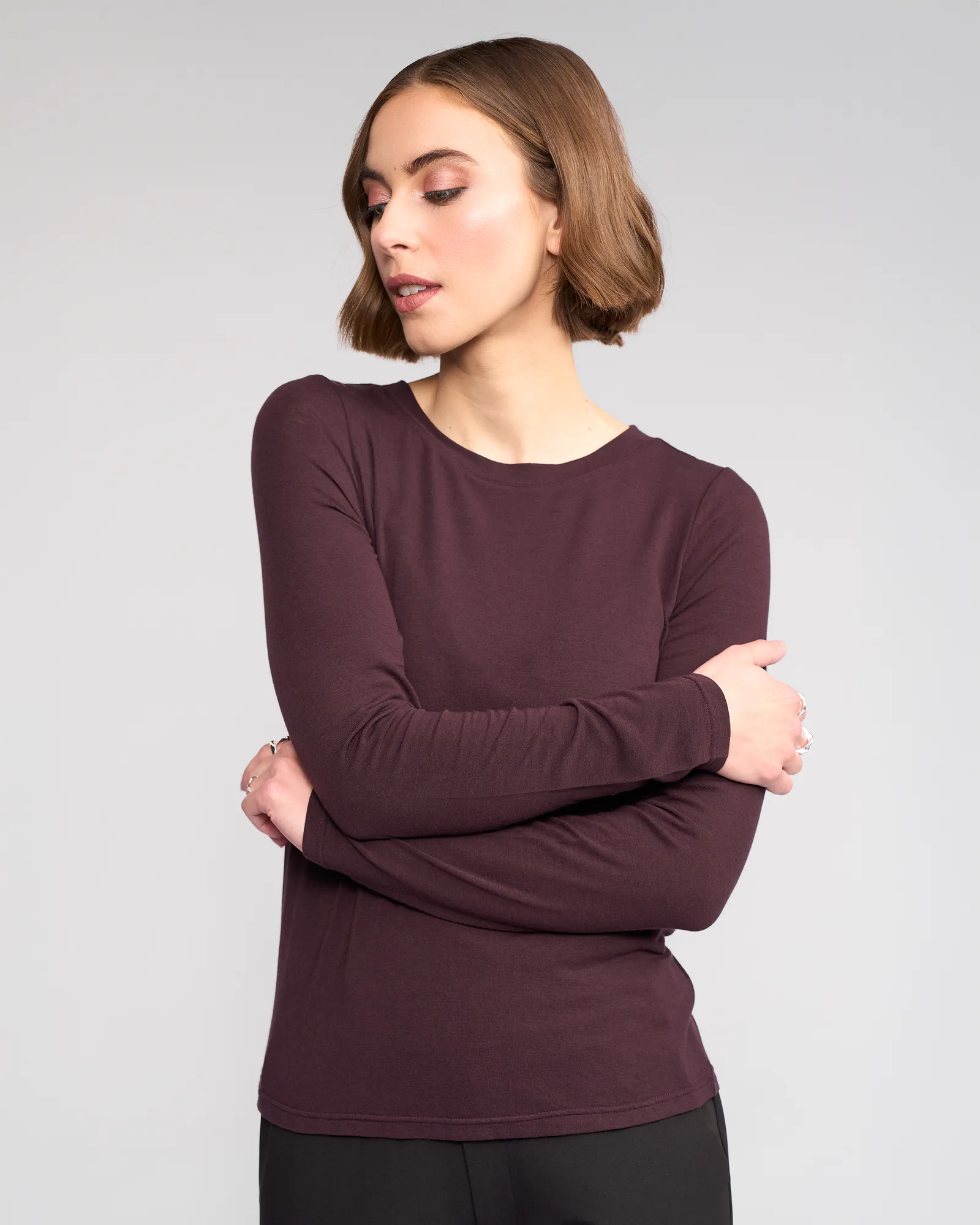 Everyday long sleeve top in Raisin, a rich, deep purplish hue, crafted from a soft Tencel, wool, and elastane blend. Featuring a round neckline and a relaxed, comfortable fit, this versatile top is perfect for layering or wearing on its own.