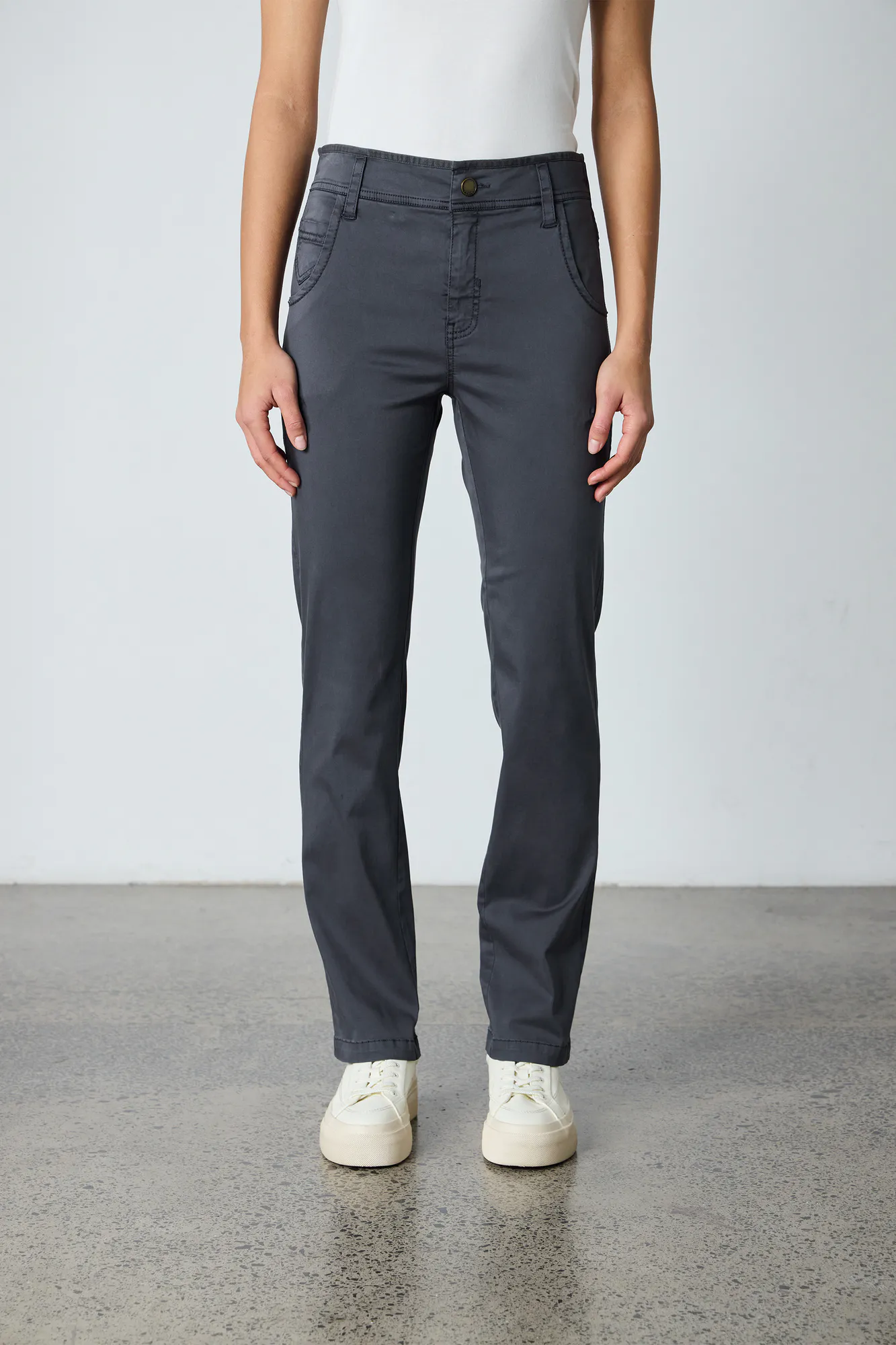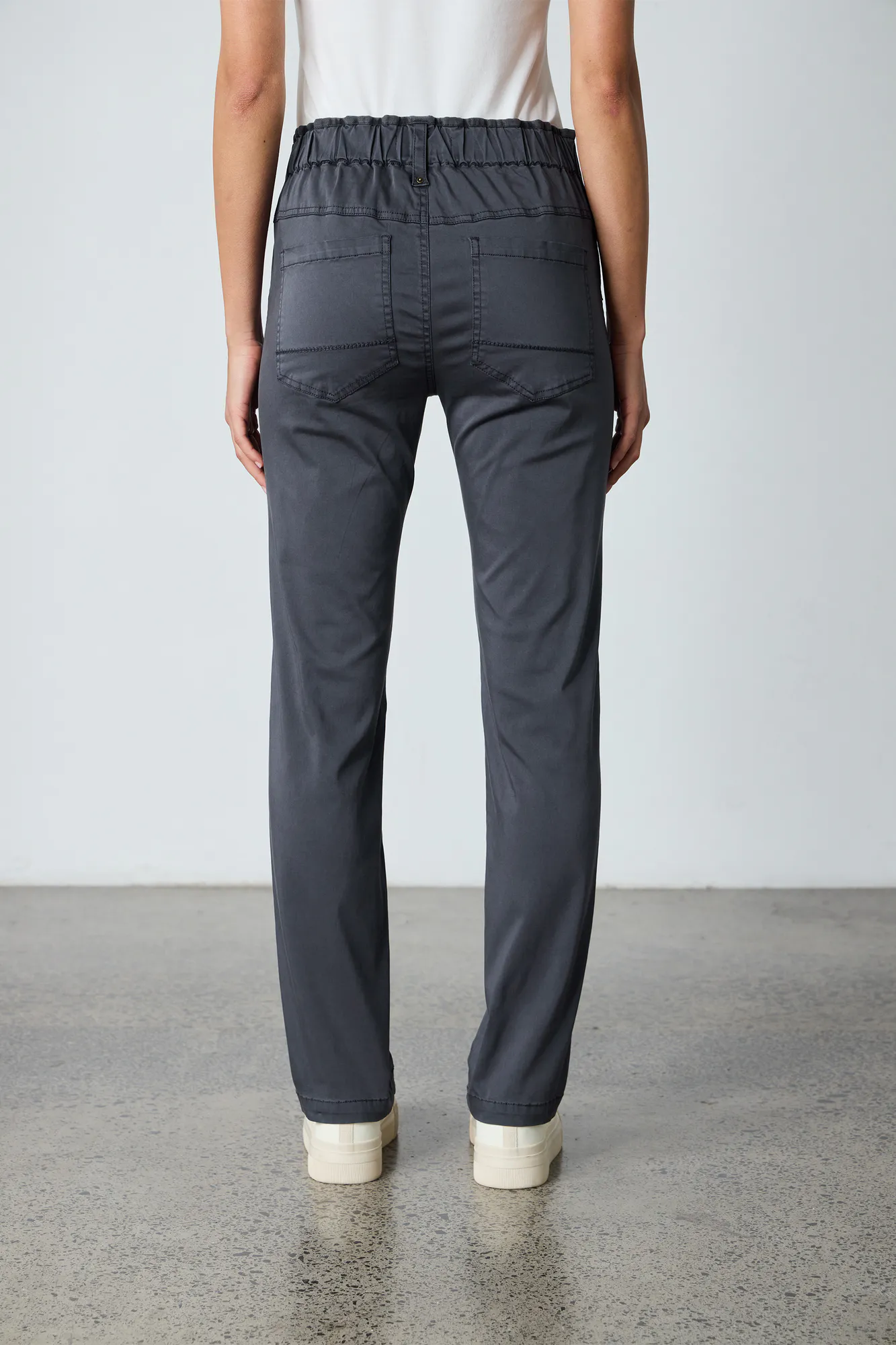 Designed for a relaxed feel, these full length pants feature a fly front and elasticated back waistband for ultimate comfort. Heavy embroidery stitching, side leg darts and binding at the waist edge add character to this off duty style. This pant is garment dyed to achieve a distressed look and soft hand feel.