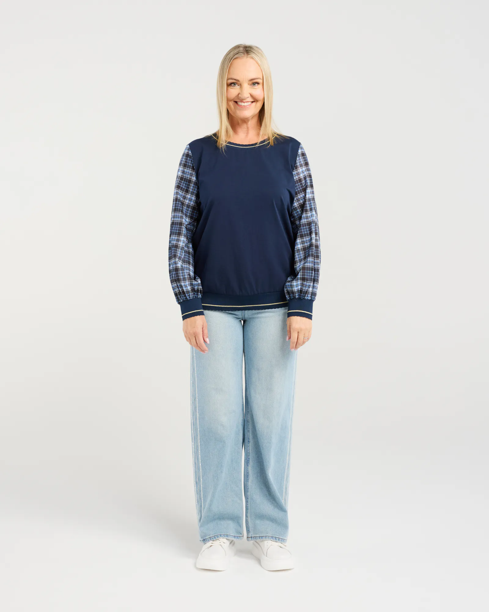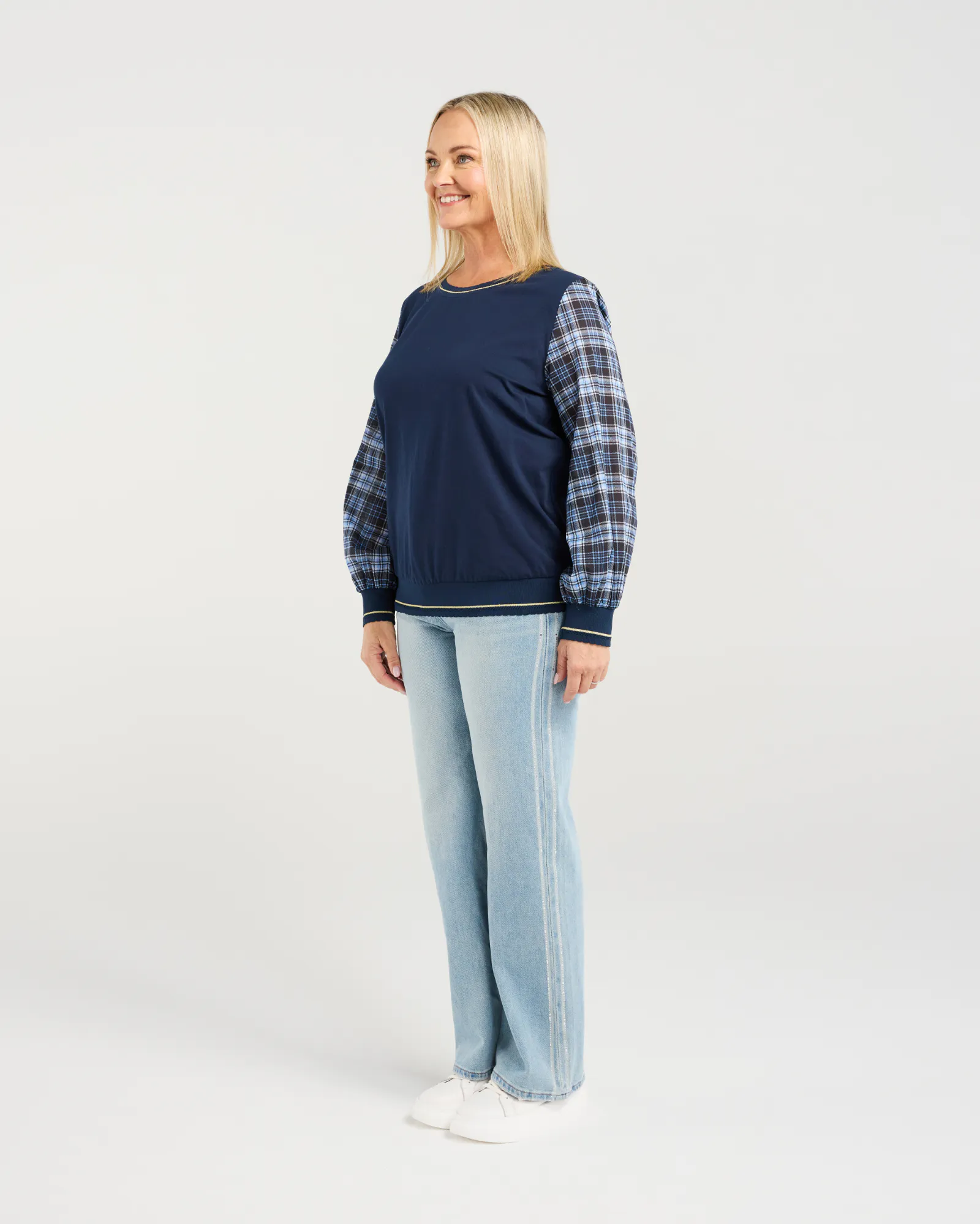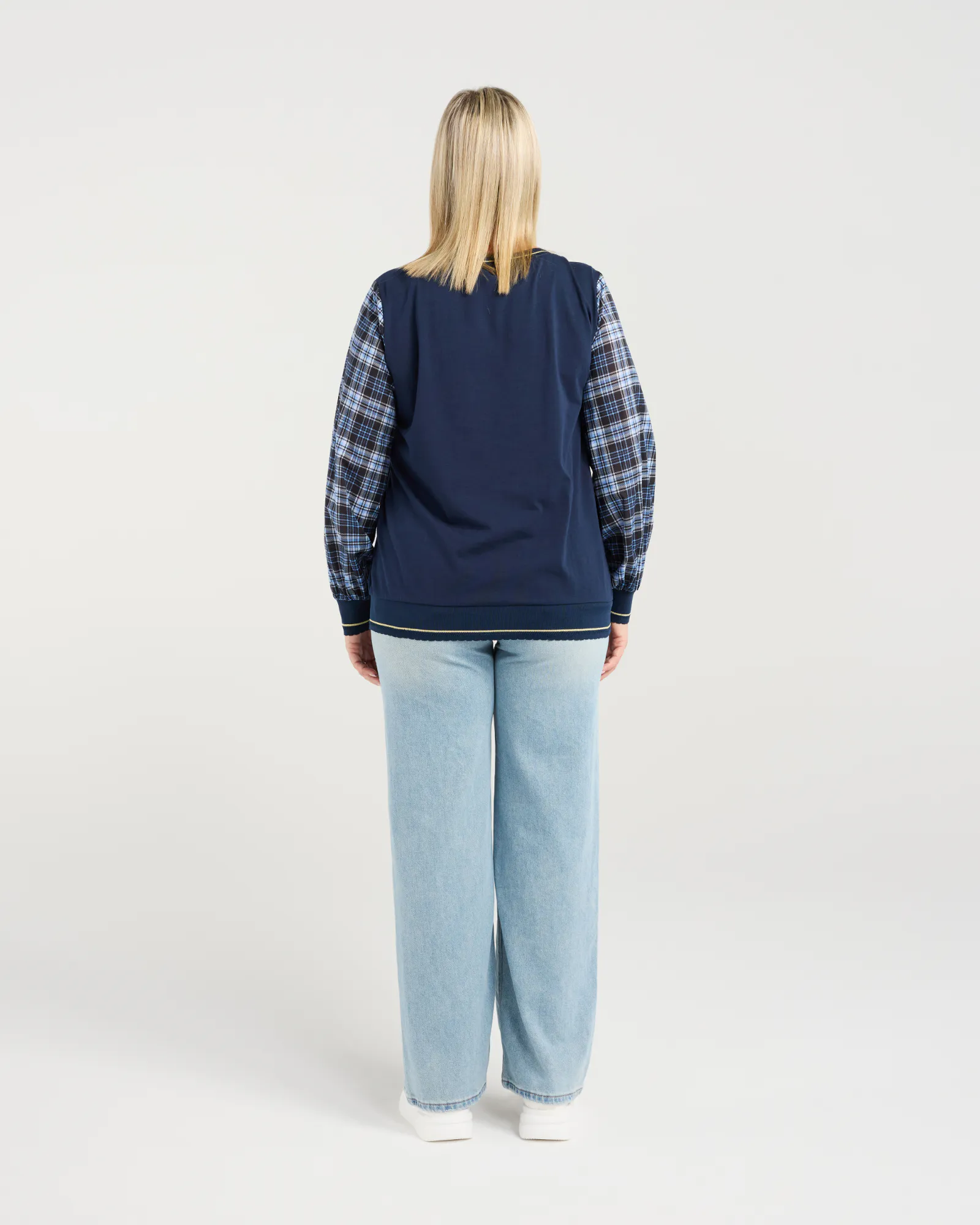This long-sleeve top stands out with contrasting sleeves that add a refined touch to your winter styling. Luxurious trims at the neckline, hem and cuffs elevate the look with subtle sophistication. An effortlessly polished piece for the season.