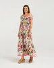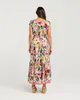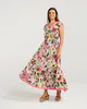 Flowy maxi dress with a romantic painted floral print in pink, green and yellow hues. Designed with flutter sleeves, tired skirt, and a scalloped lace trim for a soft, feminine charm.