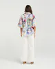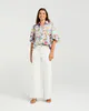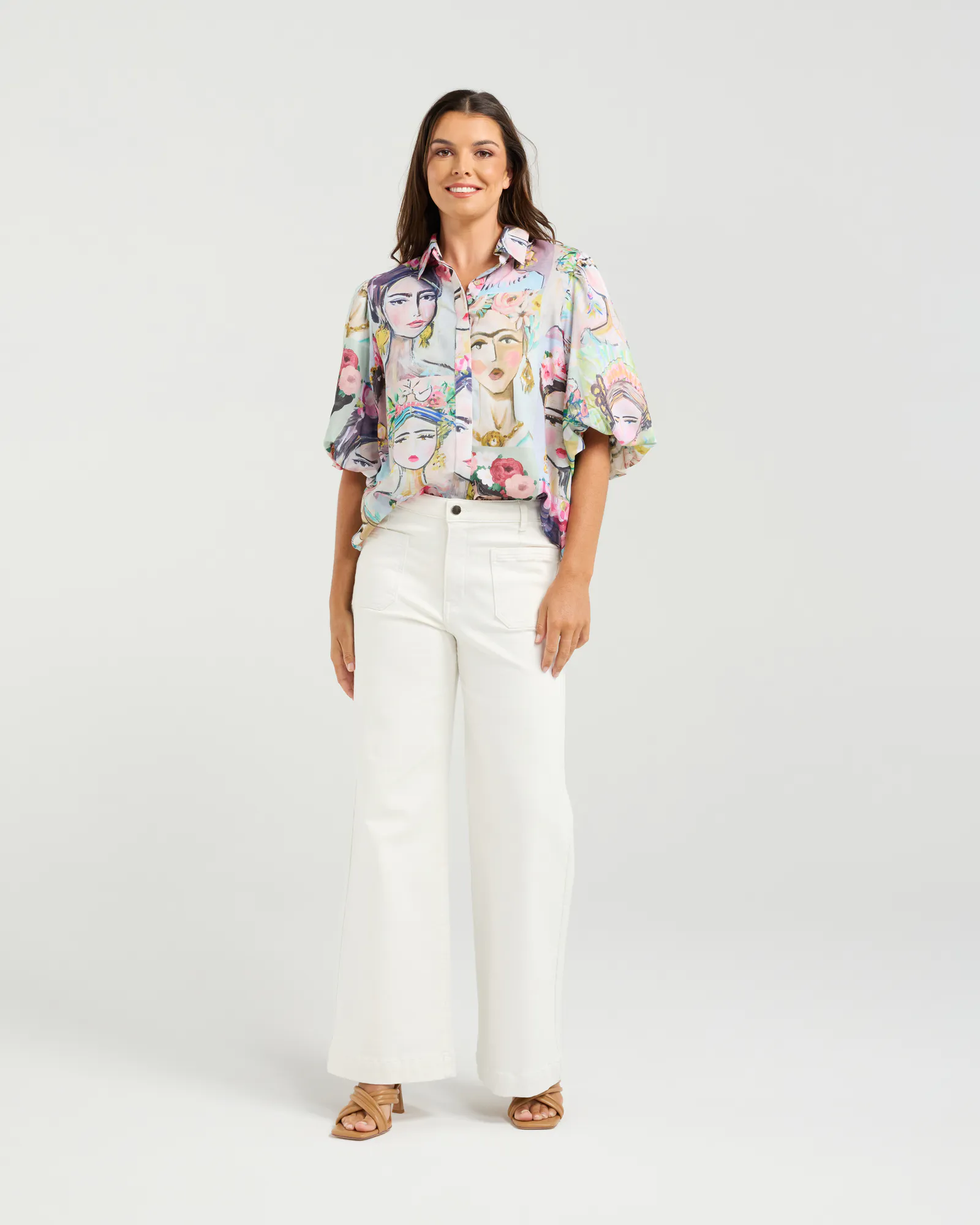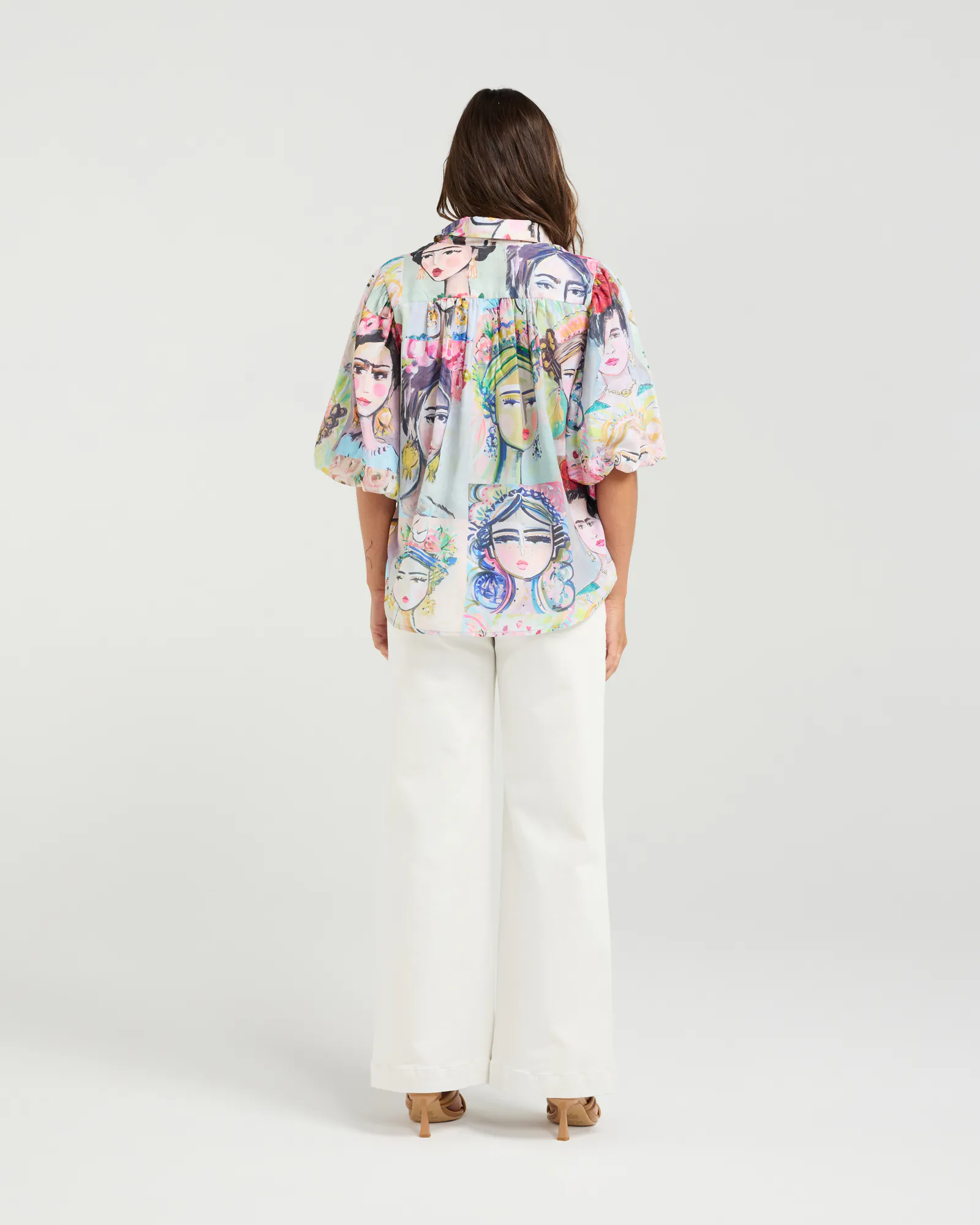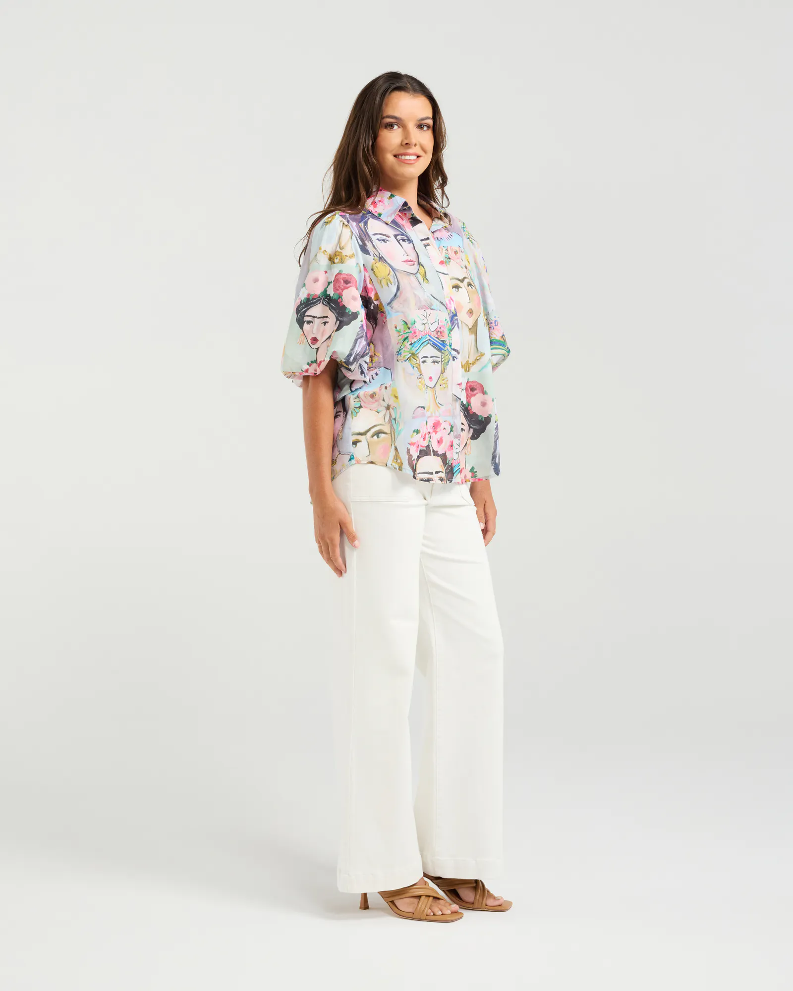 This Frida Kahlo inspired button up blouse with elbow length sleeve and subtle pleats adds drama and a feminine silhouette. Perfect for adding flair to a creative wardrobe.