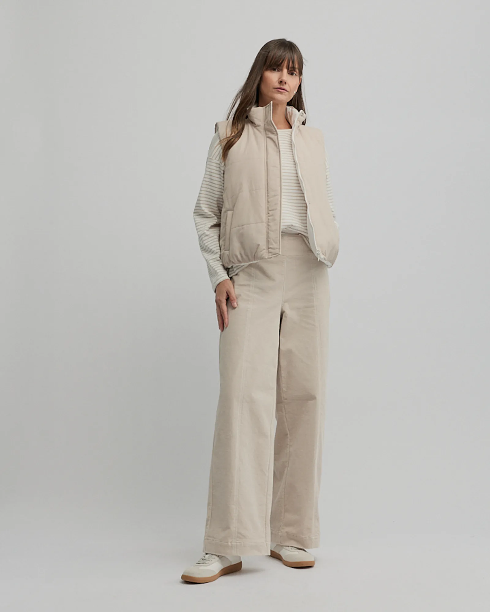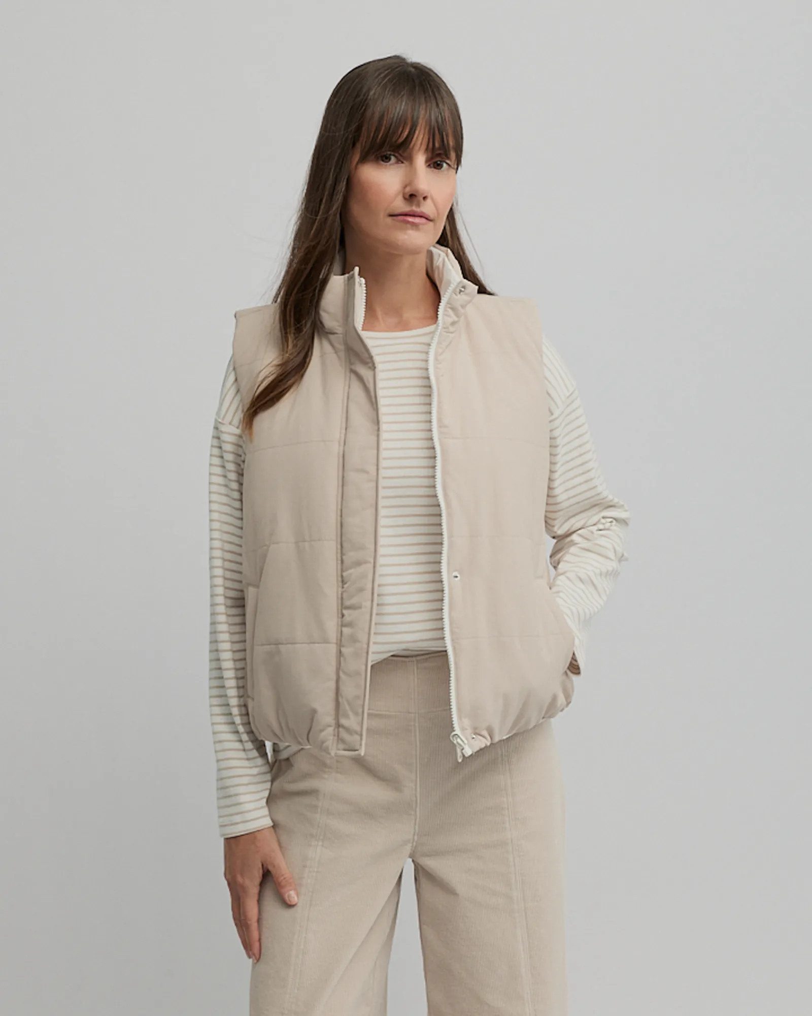 The Yarra Trail Levity Puffer in Almond Ecru combines lightweight warmth with effortless style. Built from a soft cotton blend, this sleeveless puffer delivers insulation without bulk, making it the perfect layering essential for transitional weather. The high neckline and zip-through front offer easy on-and-off convenience, while its relaxed fit pairs seamlessly over long sleeves, knitwear, or tees. Whether you're heading out for weekend adventures, travelling, or navigating casual weekdays, this versatile piece transitions from morning to evening with understated sophistication.