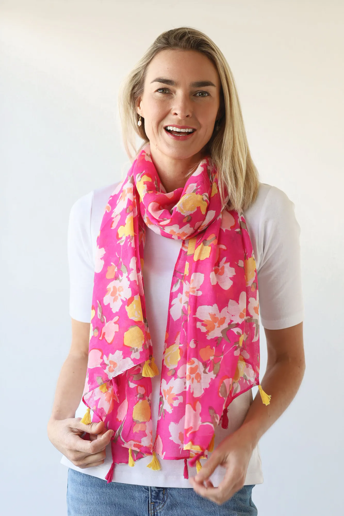 Bring a playful pop of colour to any outfit with the Archer House Abstract Flower Scarf. Crafted from soft, lightweight 100% viscose, this scarf measures 90 x 180cm and features delicate tassels, adding a charming finishing touch.