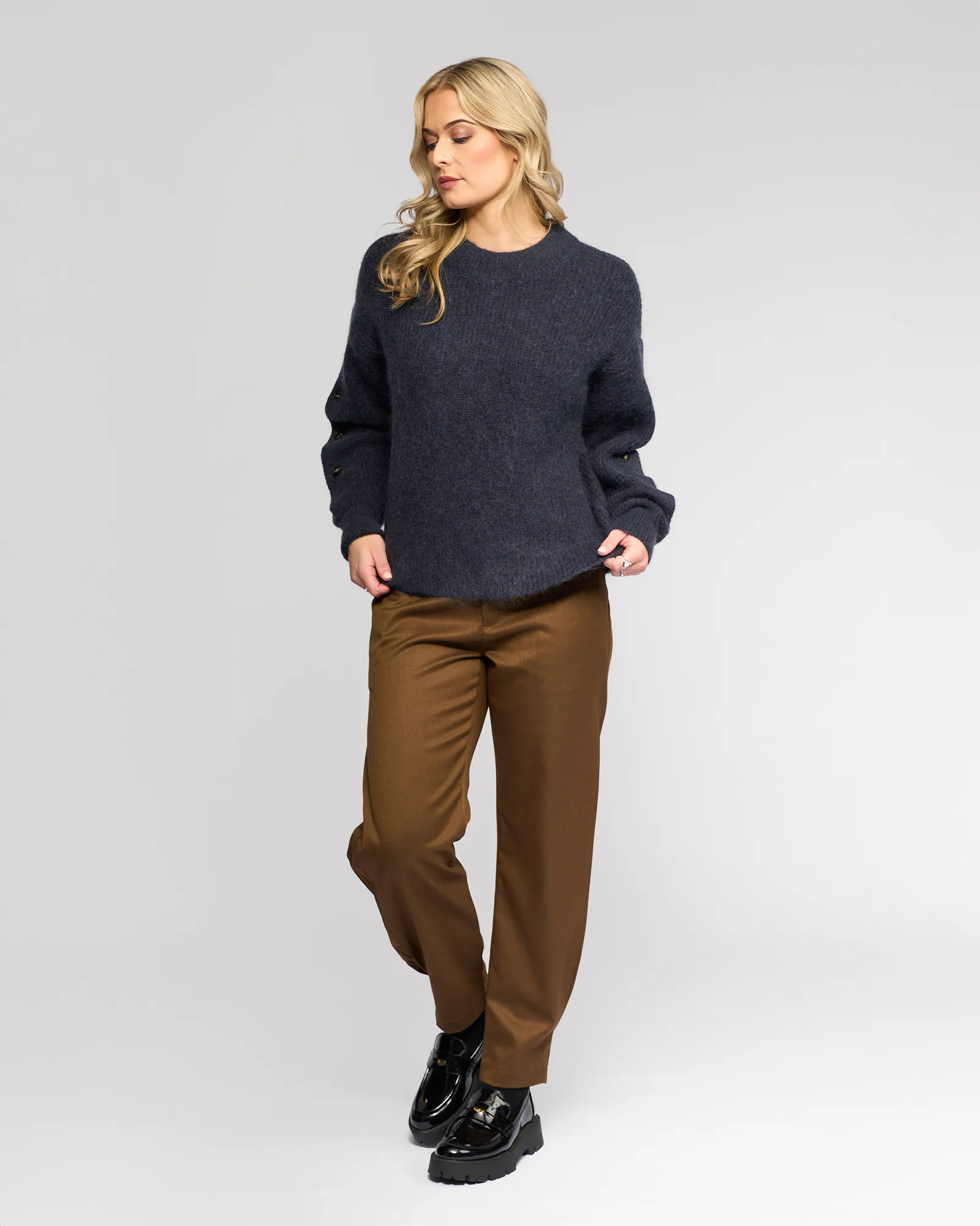 Relaxed-fit knit sweater in Ink, a dark blue, made from a soft blend including mohair and wool. Featuring a round neckline, this sweater’s standout design is its buttoned split sleeves, fastened with four black marbled buttons and finished with softly ribbed cuffs.