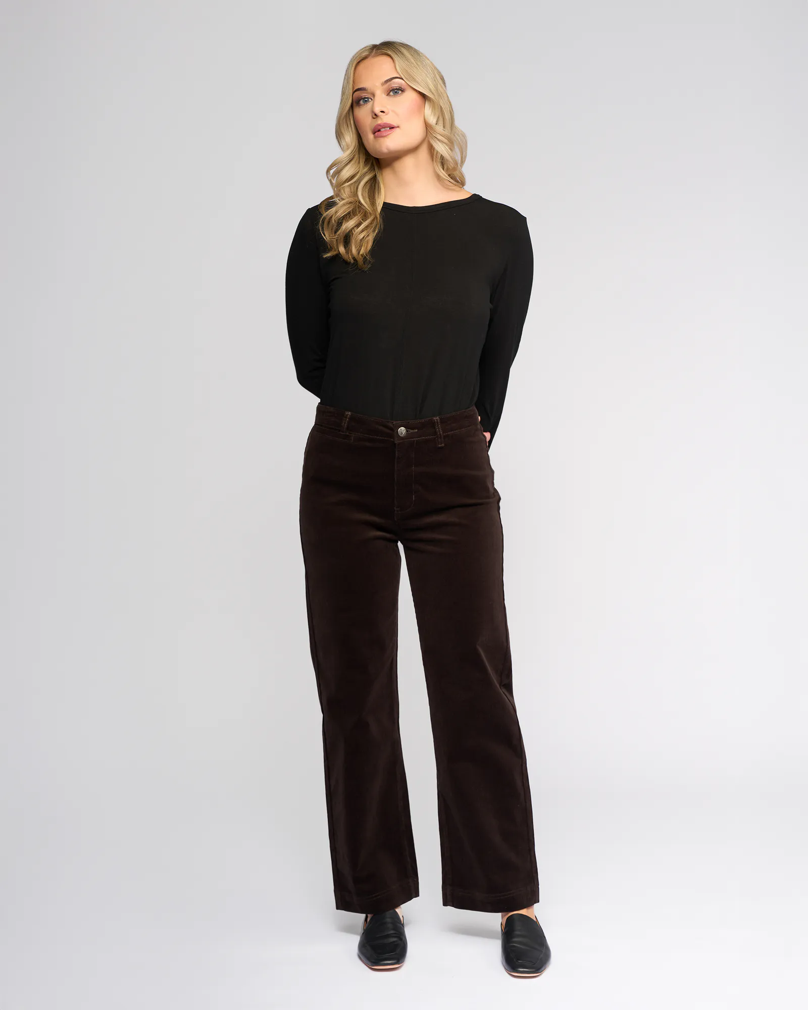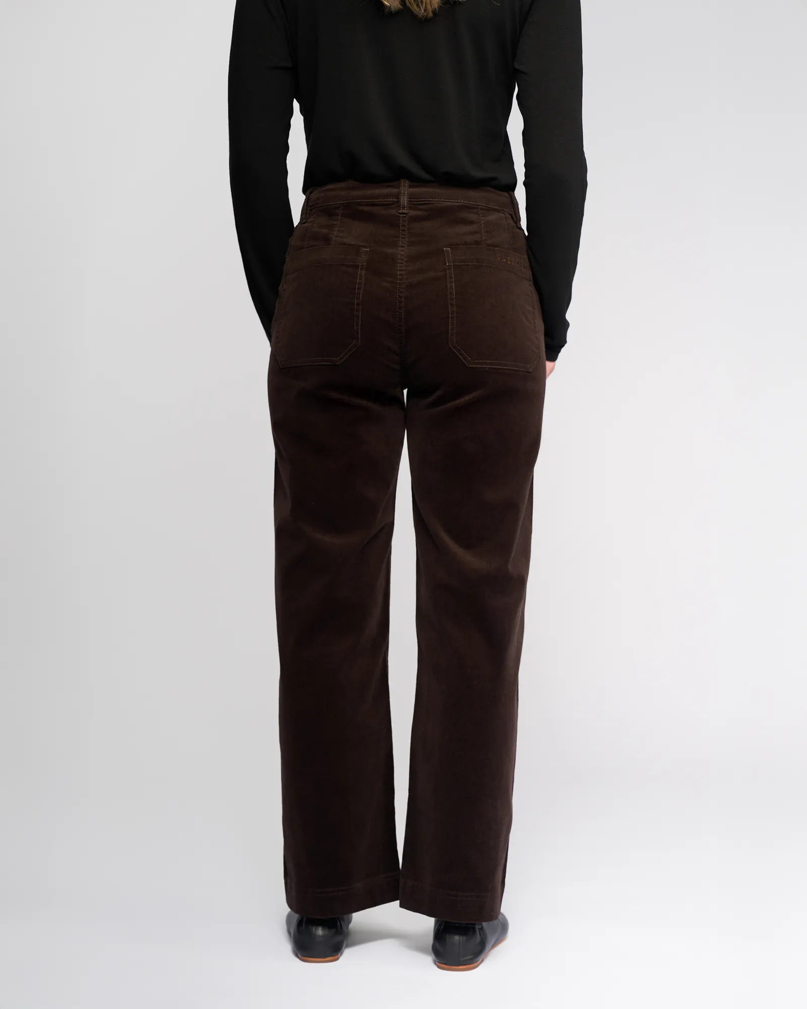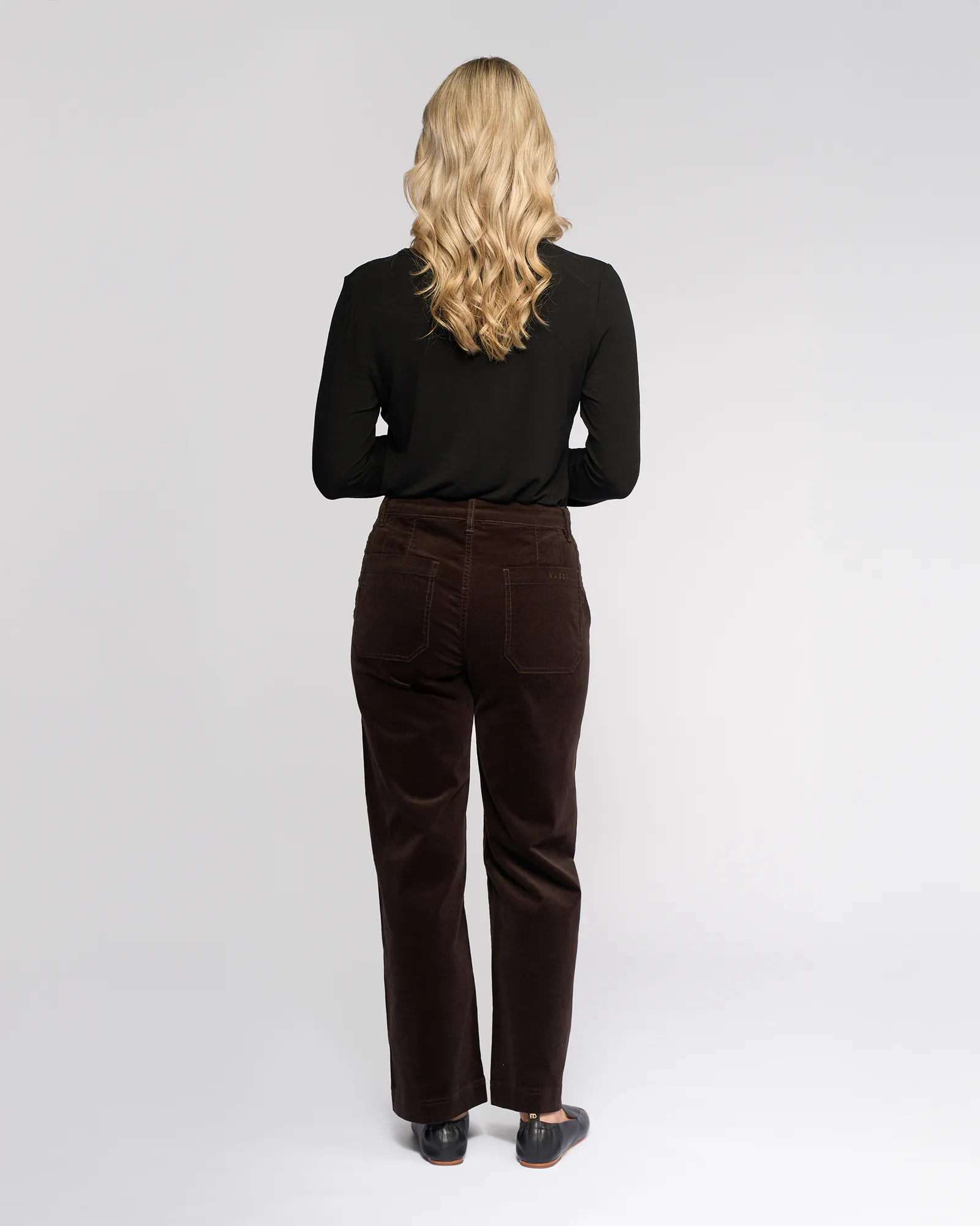Straight-leg ankle-grazer pant in stretch pinwale cord, designed in classic black. This style features a clean front with a single coin pocket detail, while subtle dart shaping above the back pockets enhances fit and contour through the back.