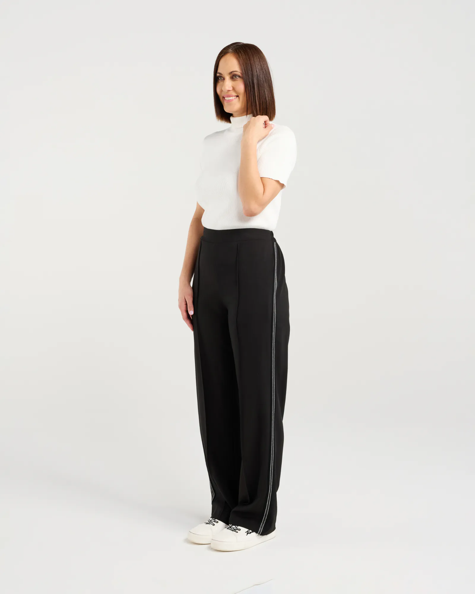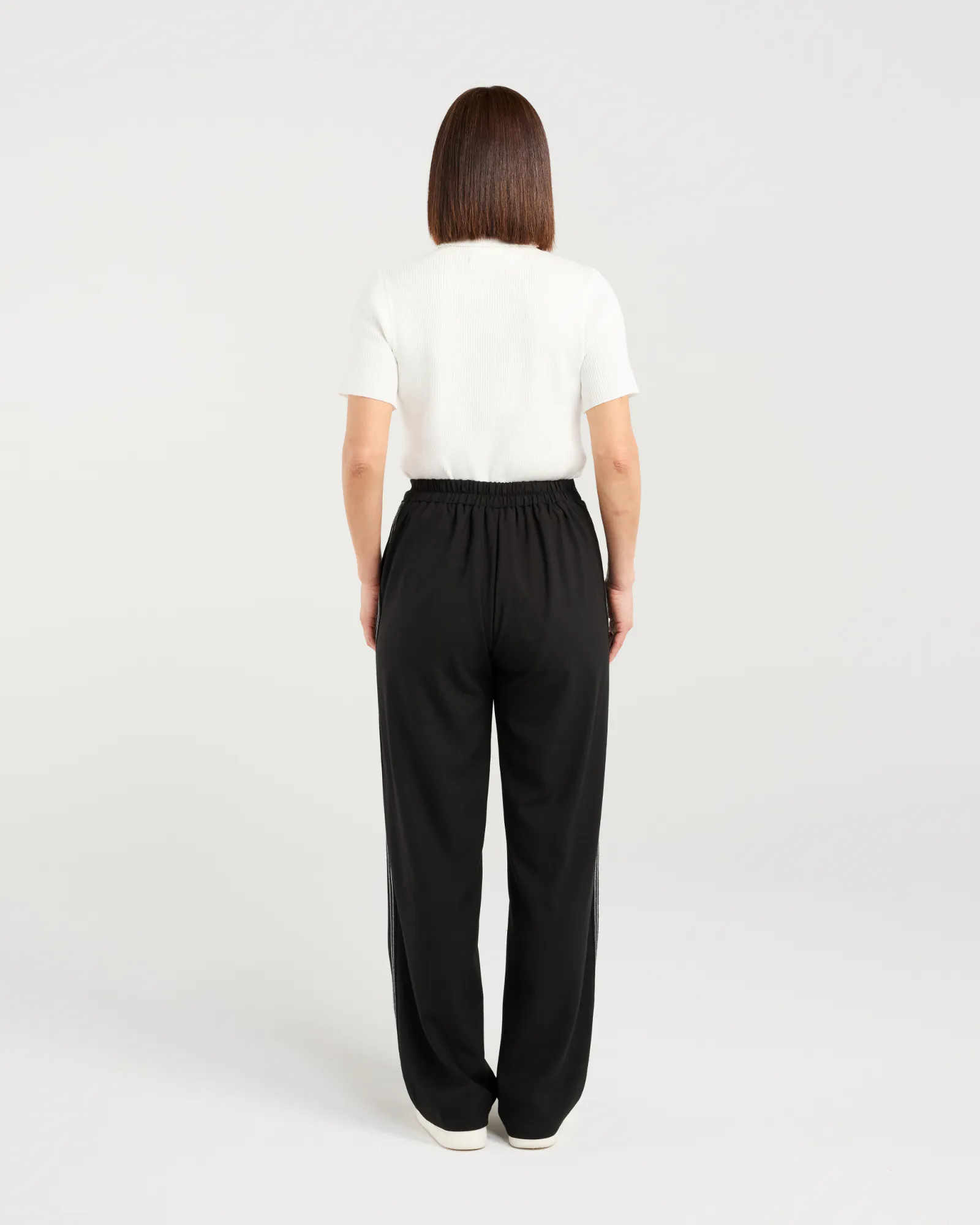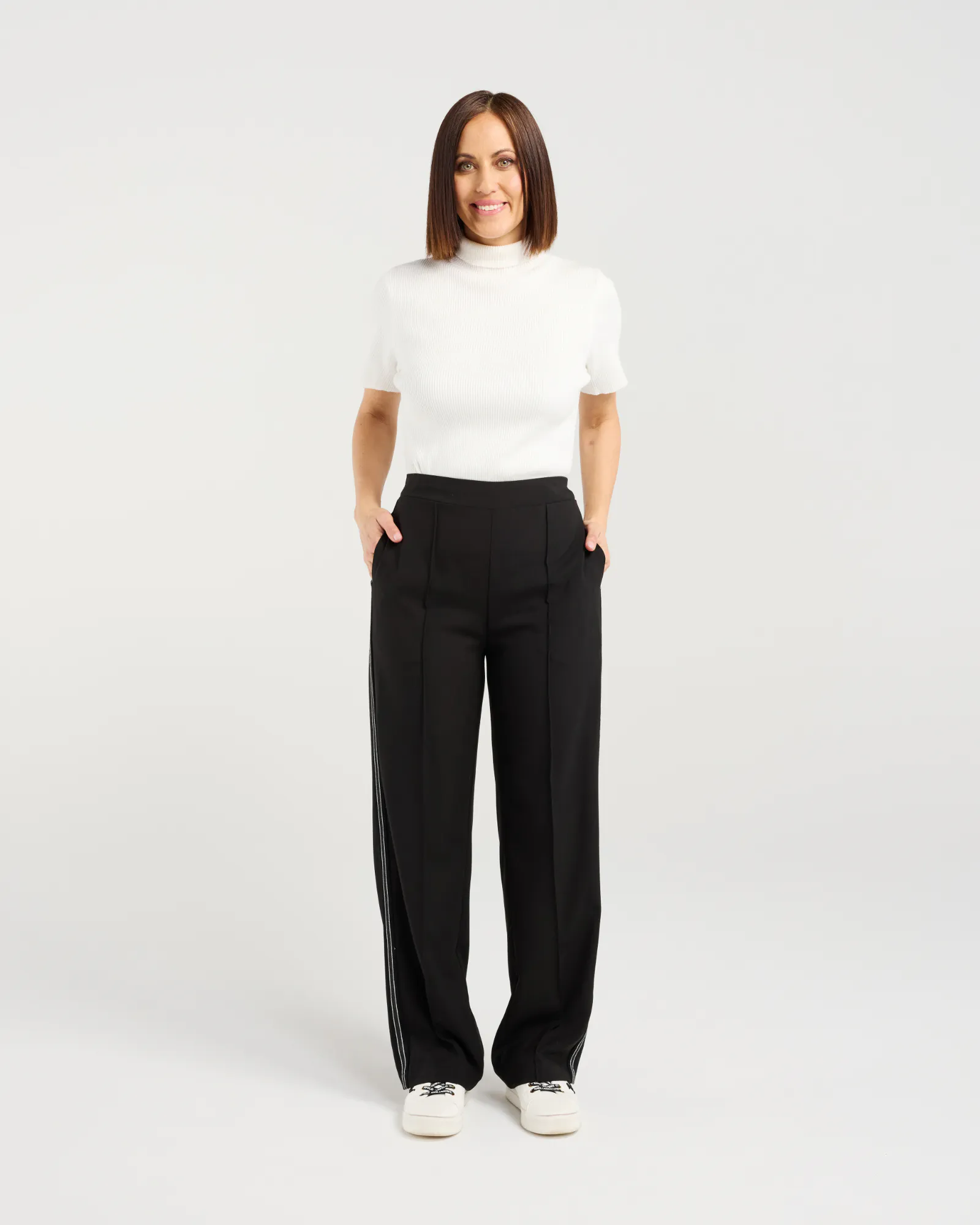 These classic black pants combine timeless elegance with modern comfort, featuring a trim stripe along the side and a folded stripe detail at the front for a flattering finish. An elasticated waistband ensures an easy, comfortable fit, making them a versatile winter wardrobe essential.