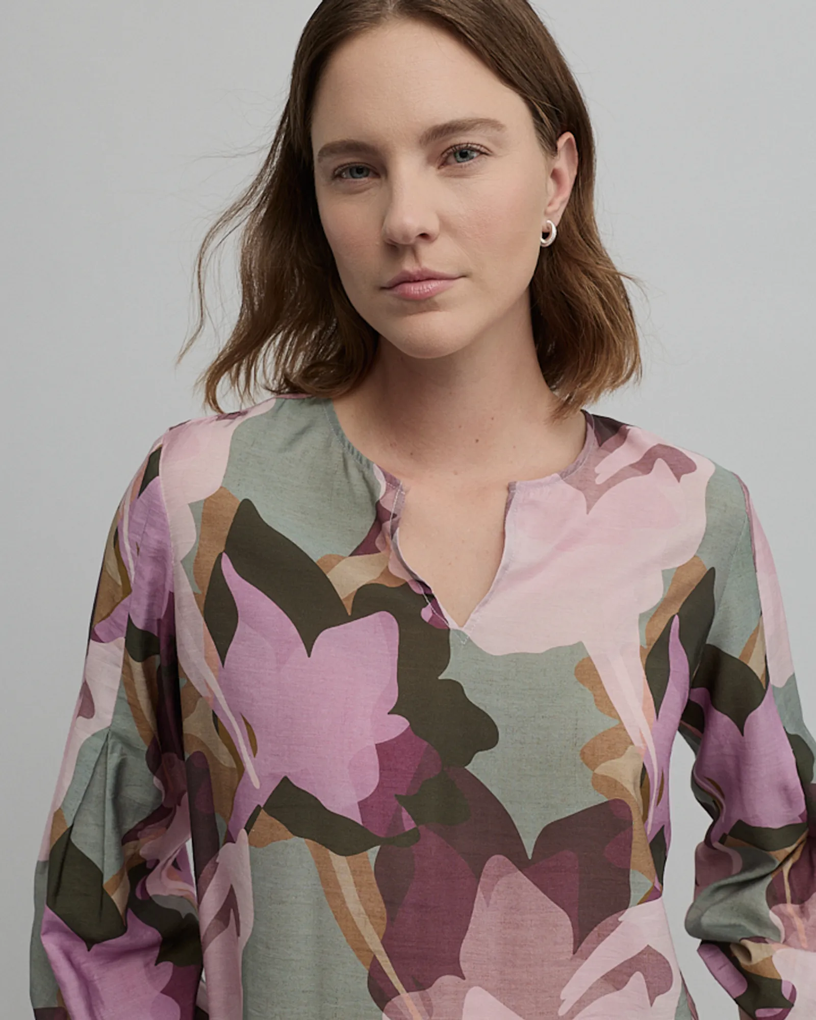 Crafted from a soft viscose blend, the Mystical Blouse features an exclusive abstract print in soft pink and green tones. Designed in a relaxed silhouette with a cutaway round neckline, it’s finished with pleated sleeves, elasticated cuffs and a hi-lo hem for gentle movement. Style it with tailored separates or denim for an effortless, polished look.