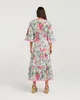 Bohemian maxi dress with a tropical floral print and bold pink embroidered trim. Features a deep V neckline, wide sleeves and a flowing shape for an effortlessly elegant look.