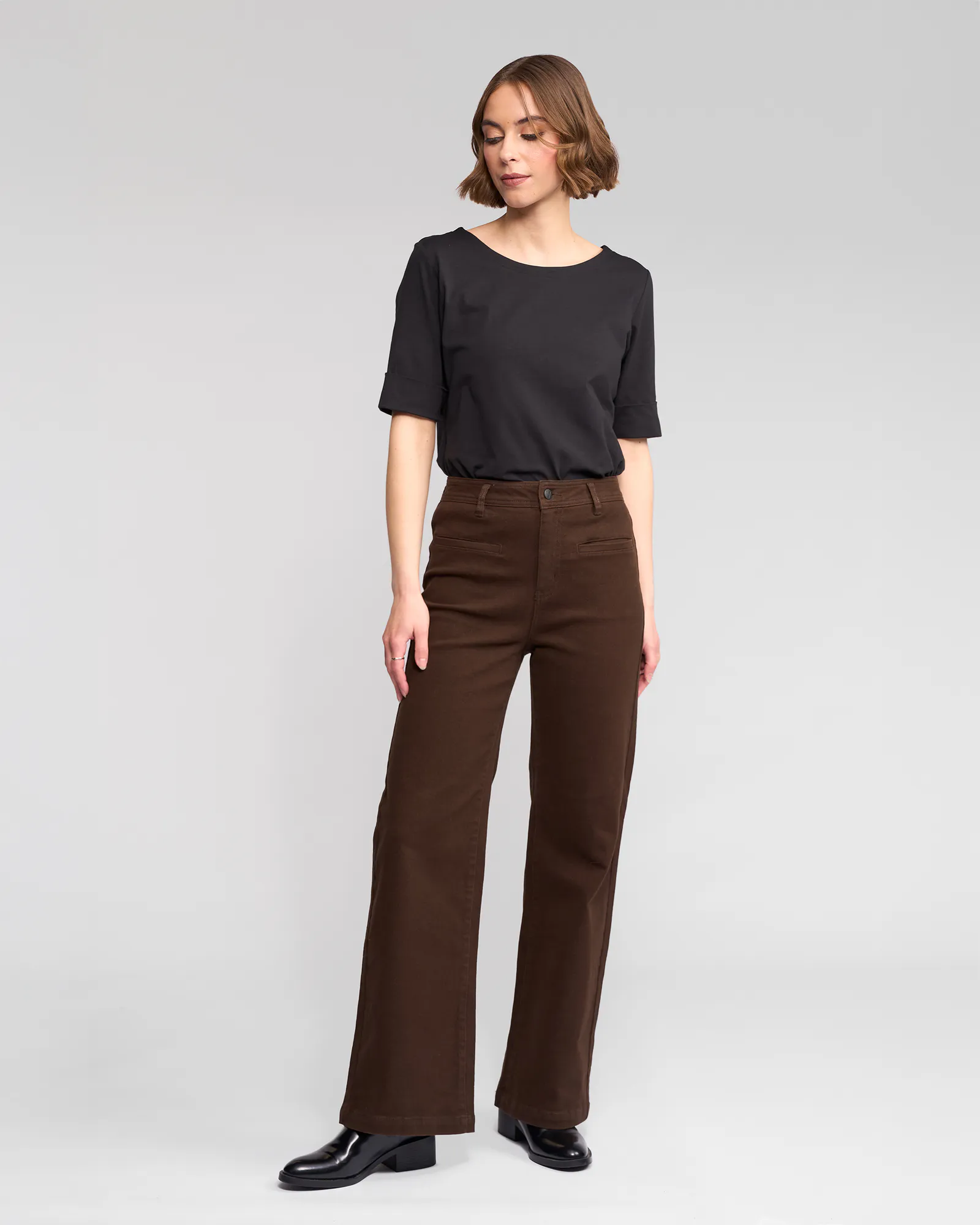 Wide-leg full-length jean in Brushed Indigo — a classic blue denim with a softly brushed interior for added warmth. Designed with front welt pockets and a modern, relaxed silhouette, this style offers a contemporary take on everyday denim.