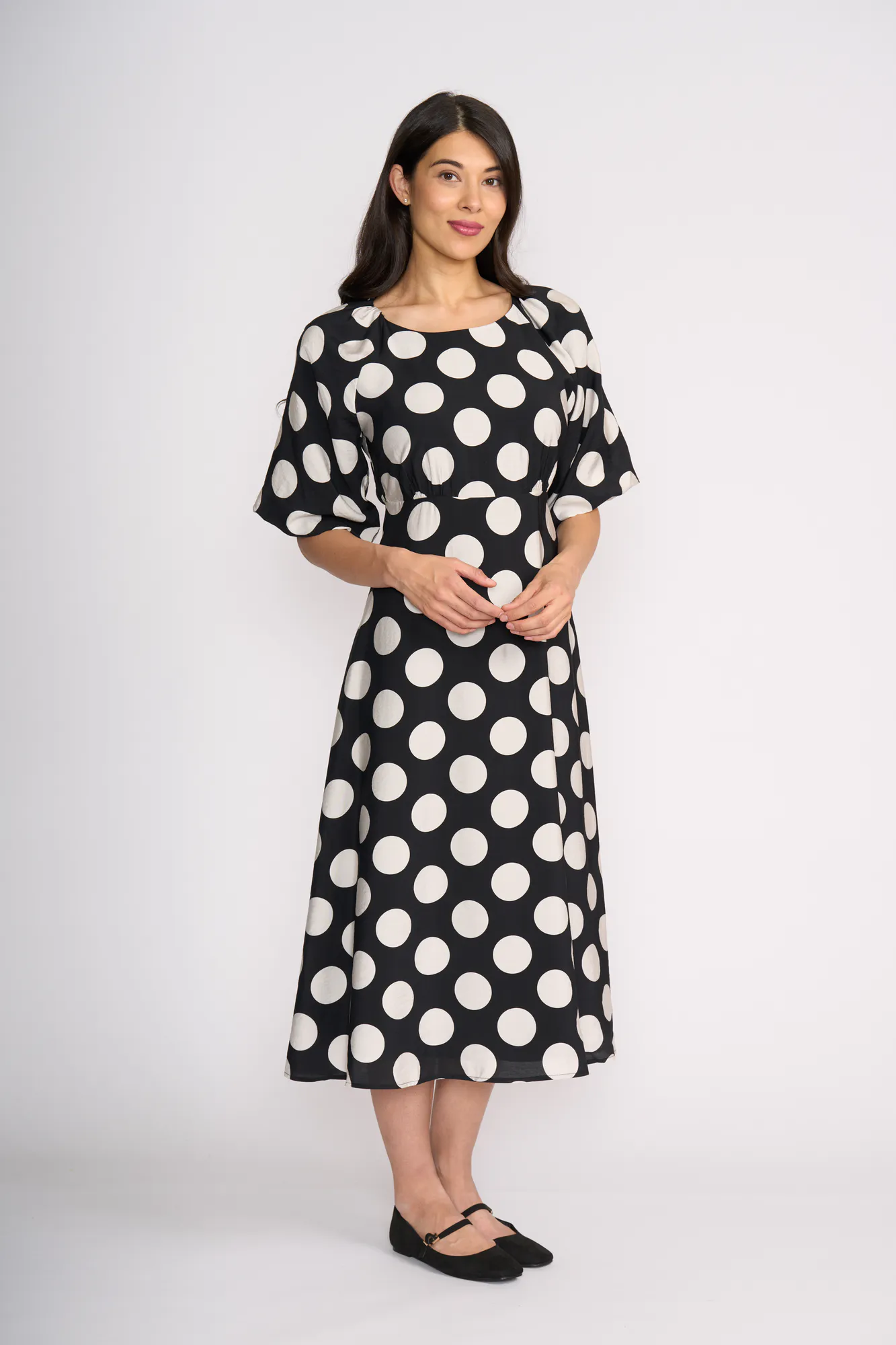 Step into effortless style with our polka dot maxi dress. Perfect for any occasion, it features delicate gathering details and playful puff sleeves. At approximately 125cm long (size 10), it flatters beautifully.