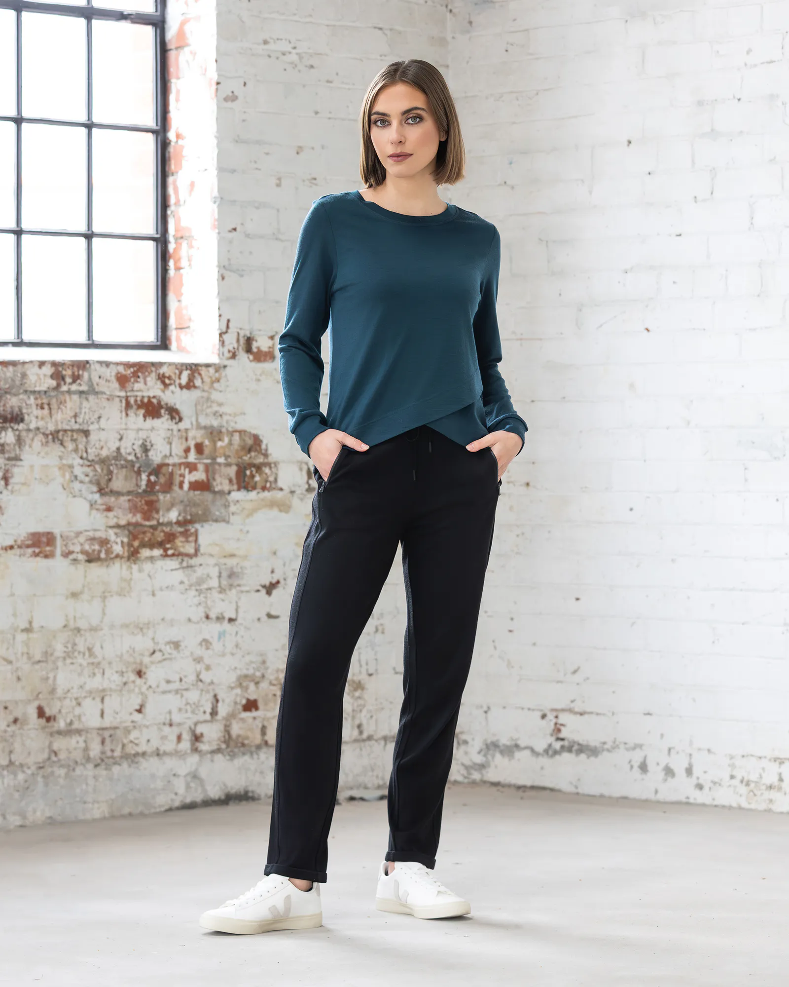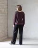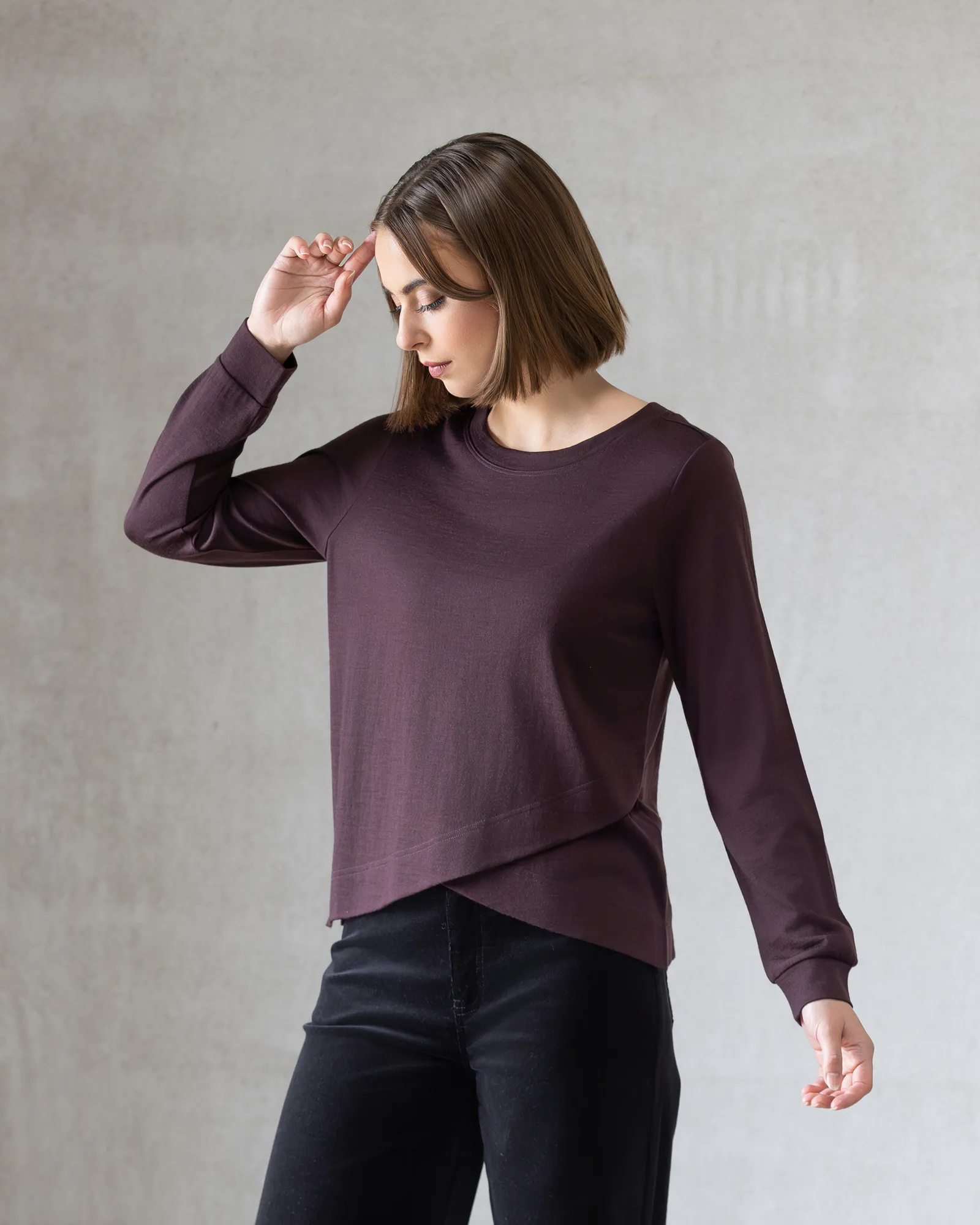 Merino long-sleeve top in Berry — a deep plum tone. Featuring a relaxed silhouette and a layered crossover hem, this style offers warmth, comfort, and a gently modern finish for everyday wear.