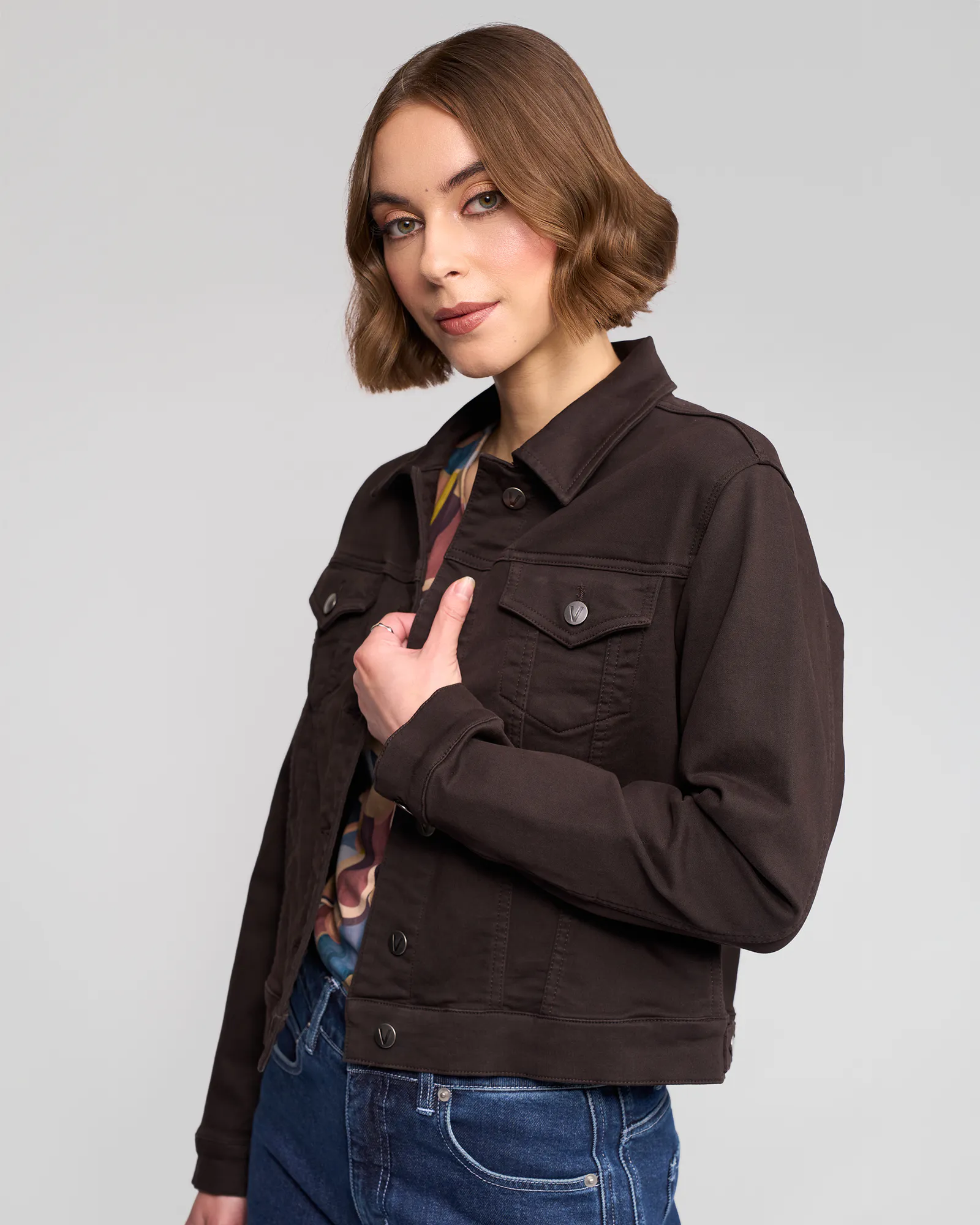 A classic button-up jacket made from our soft, velvety moleskin-inspired stretch fabric in a rich chocolate brown. Designed in a relaxed fit, this style features metal ‘V’ logo jean buttons, chest pockets, and adjustable tabs at the back waist for versatile shaping. Finished with ‘V’ embroidery at the centre back neck.