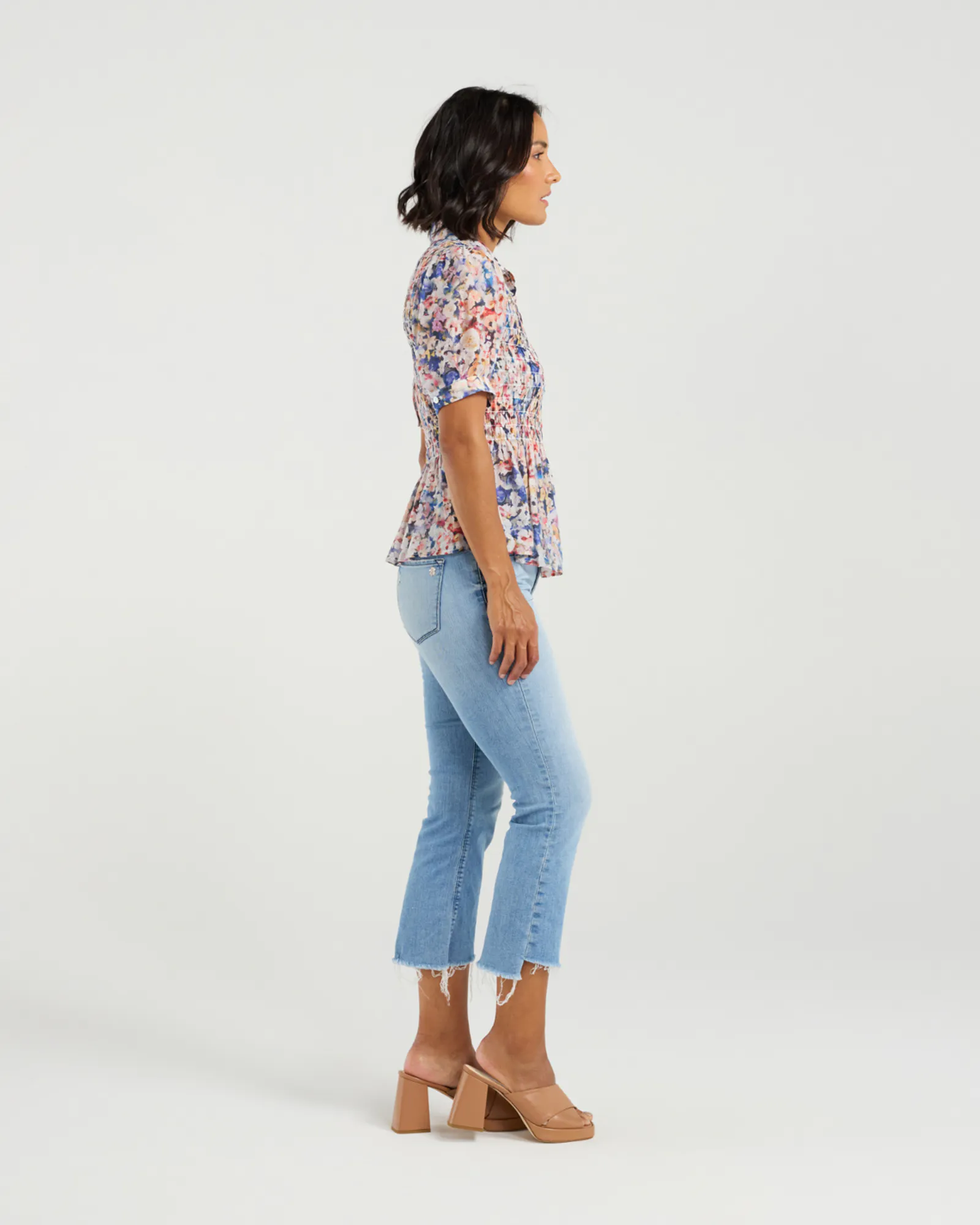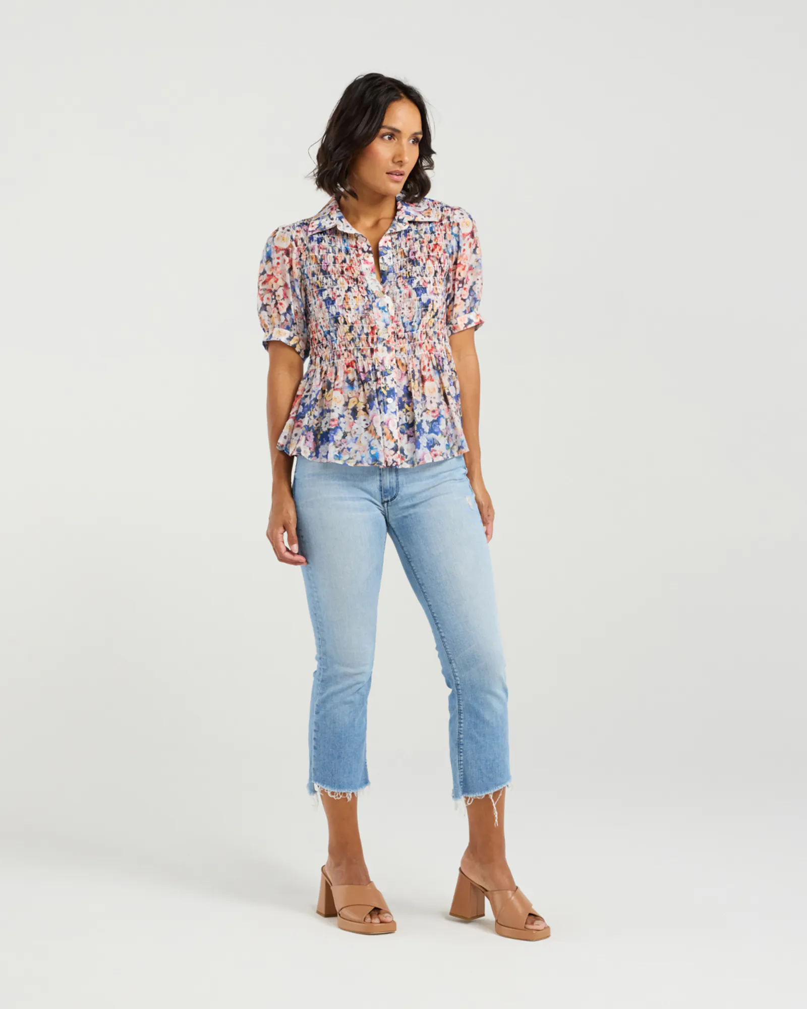 Softly structured with a romantic twist, this short-sleeved shirt features gently puffed sleeves and delicate smocking across the body. The gathered detail cinches the waist and naturally flares into a subtle peplum, creating a flattering, feminine silhouette. Finished with refined tailoring and a hint of volume, it’s a perfect balance of ease and elegance—ideal for dressing up or down with effortless charm.