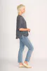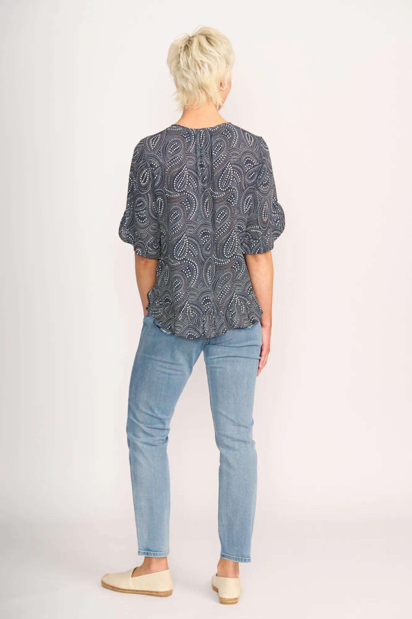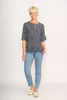 The perfect Summer top to wear with your favourite Memo jeans. Ruffles at the cuff and hem add a feminine touch. Keyhole front neck opening (with a hidden hook & eye) means you can wear this top as a scoop neck or V neck.. Body length from the shoulder to the hem is approx. 68.5cm (size 12)