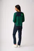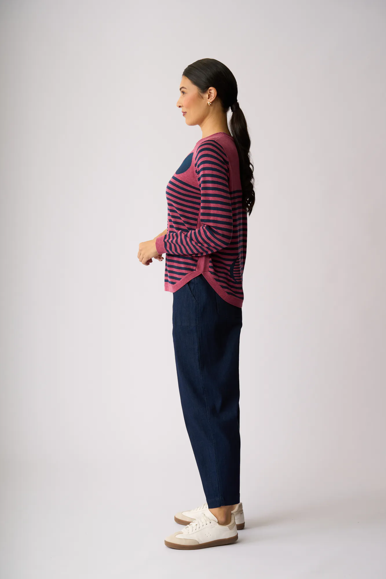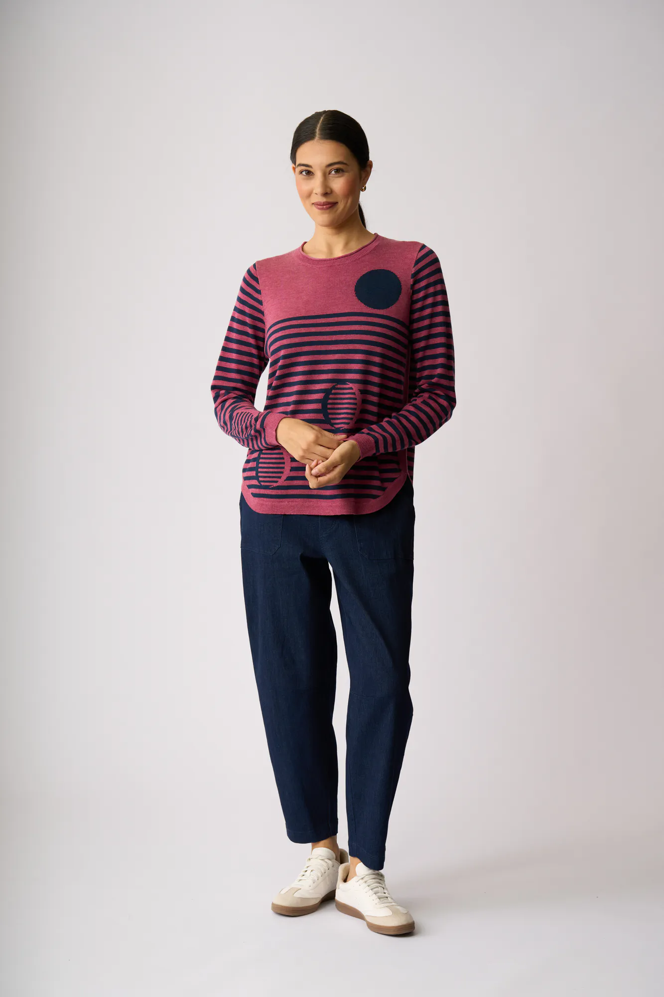 This scoop neck sweater has full length sleeves and a knit design that features a contemporary spot and stripe design that combines comfort and style, making it a perfect addition to any wardrobe.