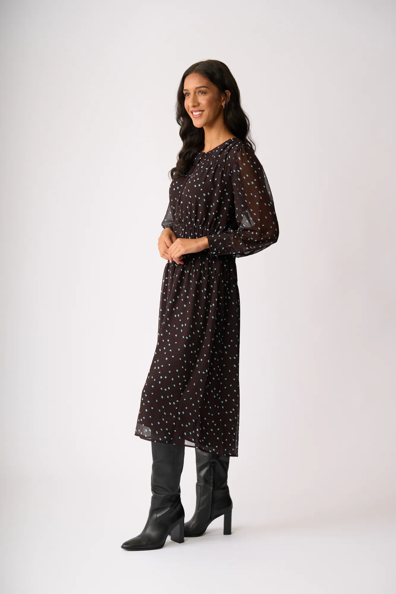 Gathering detail at the shoulder seams, around the front and back of the neckline and at the cuff seam.