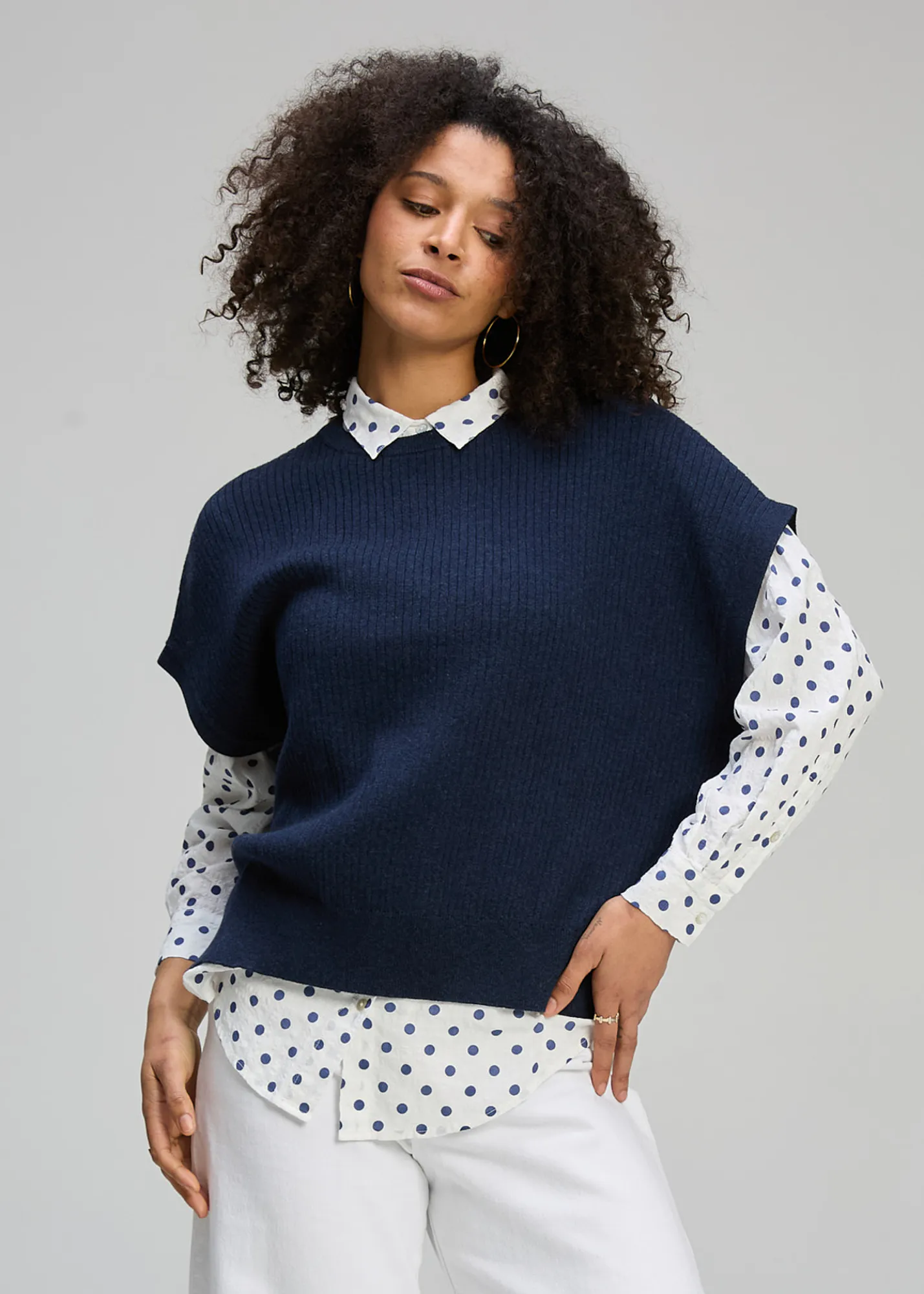 Perfect layered over crisp shirts or worn on its own in milder weather, this sleeveless knit pairs seamlessly with denim, tailored trousers or relaxed weekend styles.