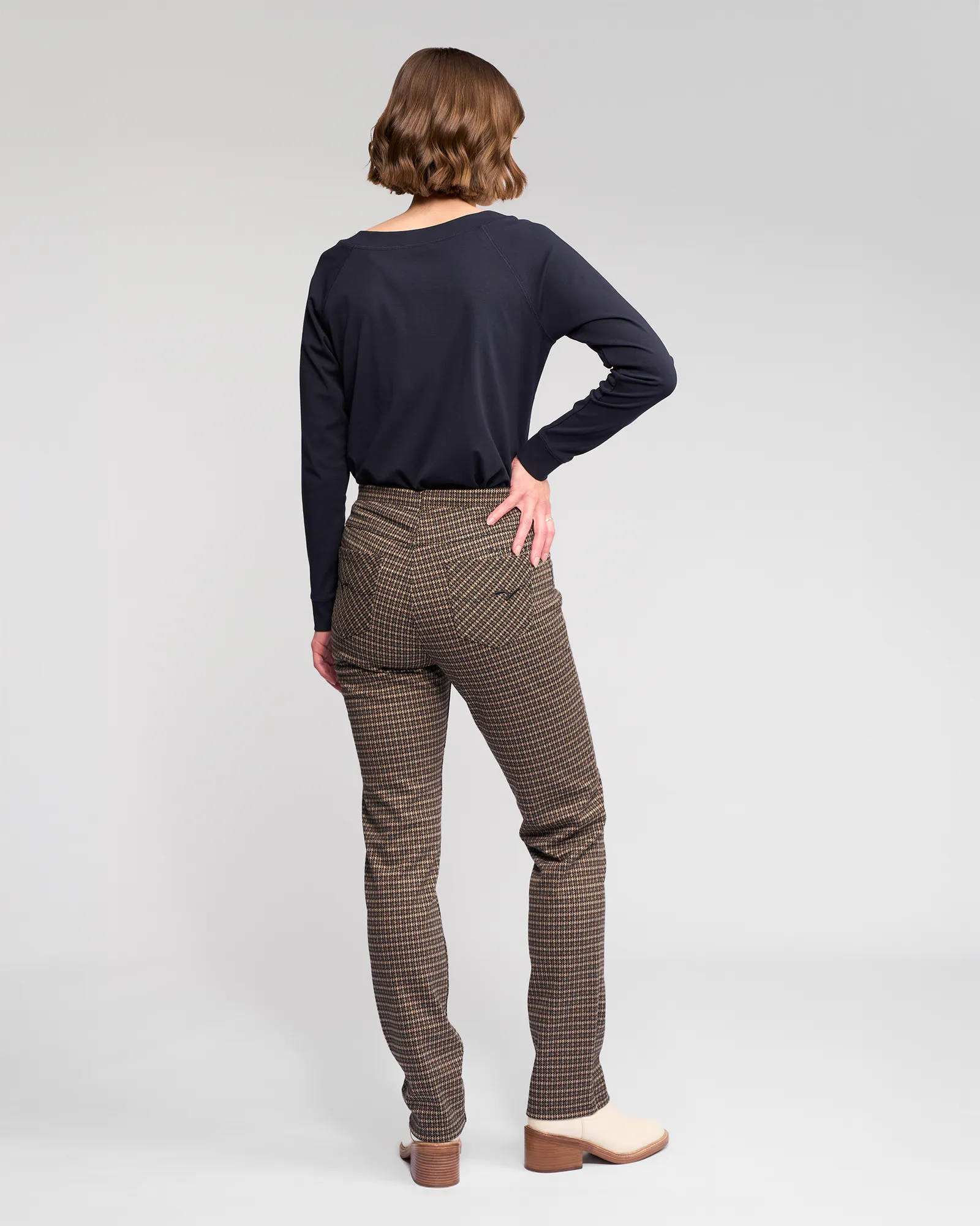 Full-length slim pant in a comfortable knit fabric, designed in our Nova print — a black and oat check with a navy blue fleck throughout. Made in an easy pull-on style with stretch for a comfortable fit, this pant features refined denim-inspired details including a faux fly, faux front pockets, and back patch pockets.