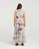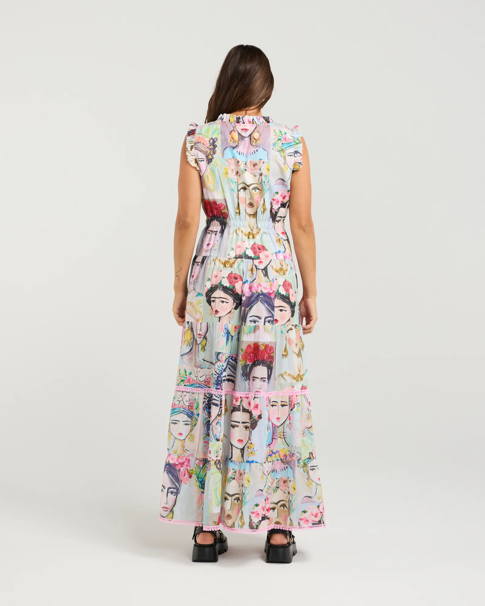 Maxi dress with a Frida Carlo inspired print, featuring frill trimmed sleeves and neckline. Designed with tiered panels and pink lace accents for a whimsical, artistic charm.