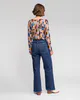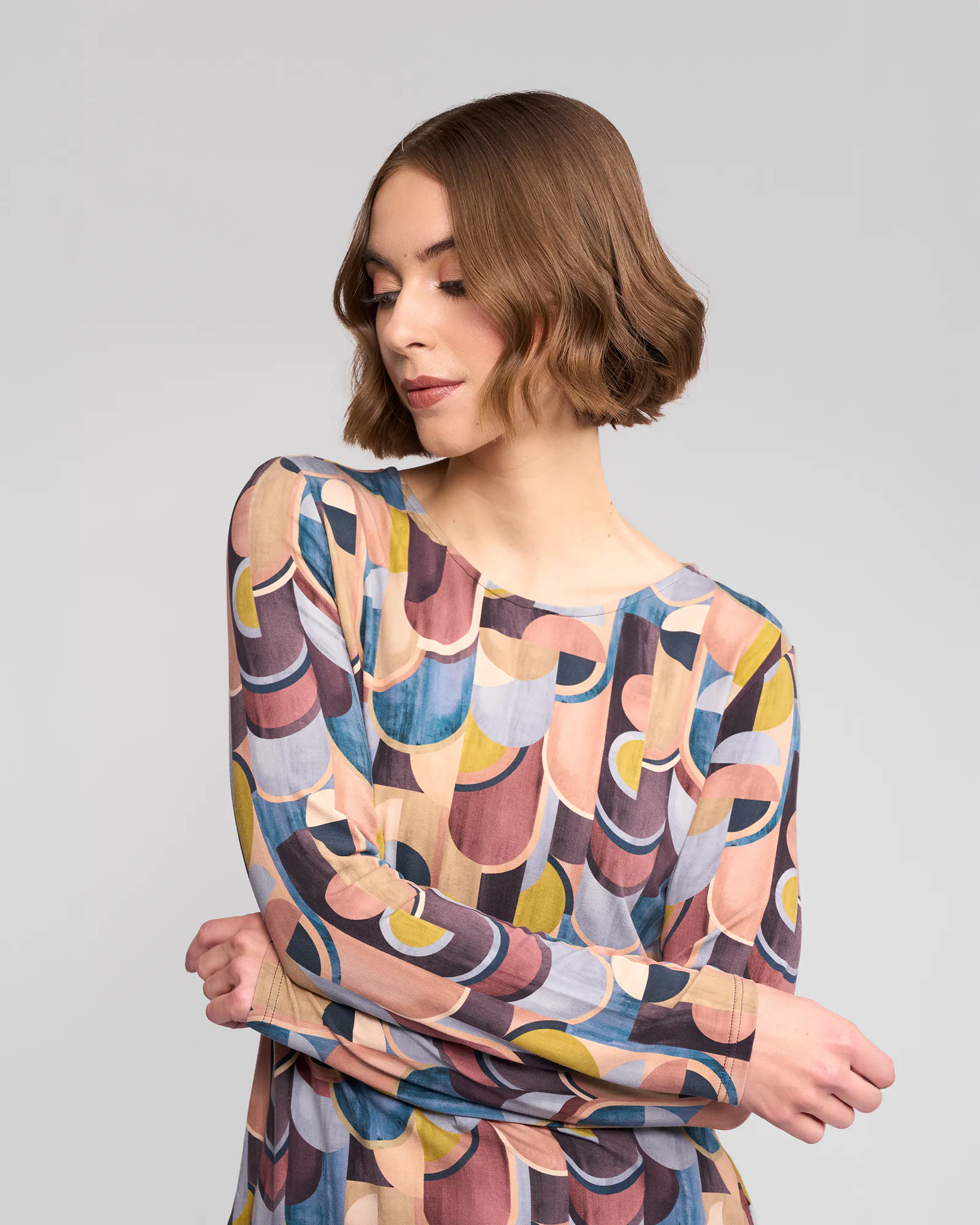 Long-sleeve round-neck top in our Haven print — a deep inky base with a fine-scale mix of geometric and floral motifs in green, teal, red, yellow, and white. Made from soft stretch jersey, this slim-fit style is an easy layering piece that pairs effortlessly with denim or cord.