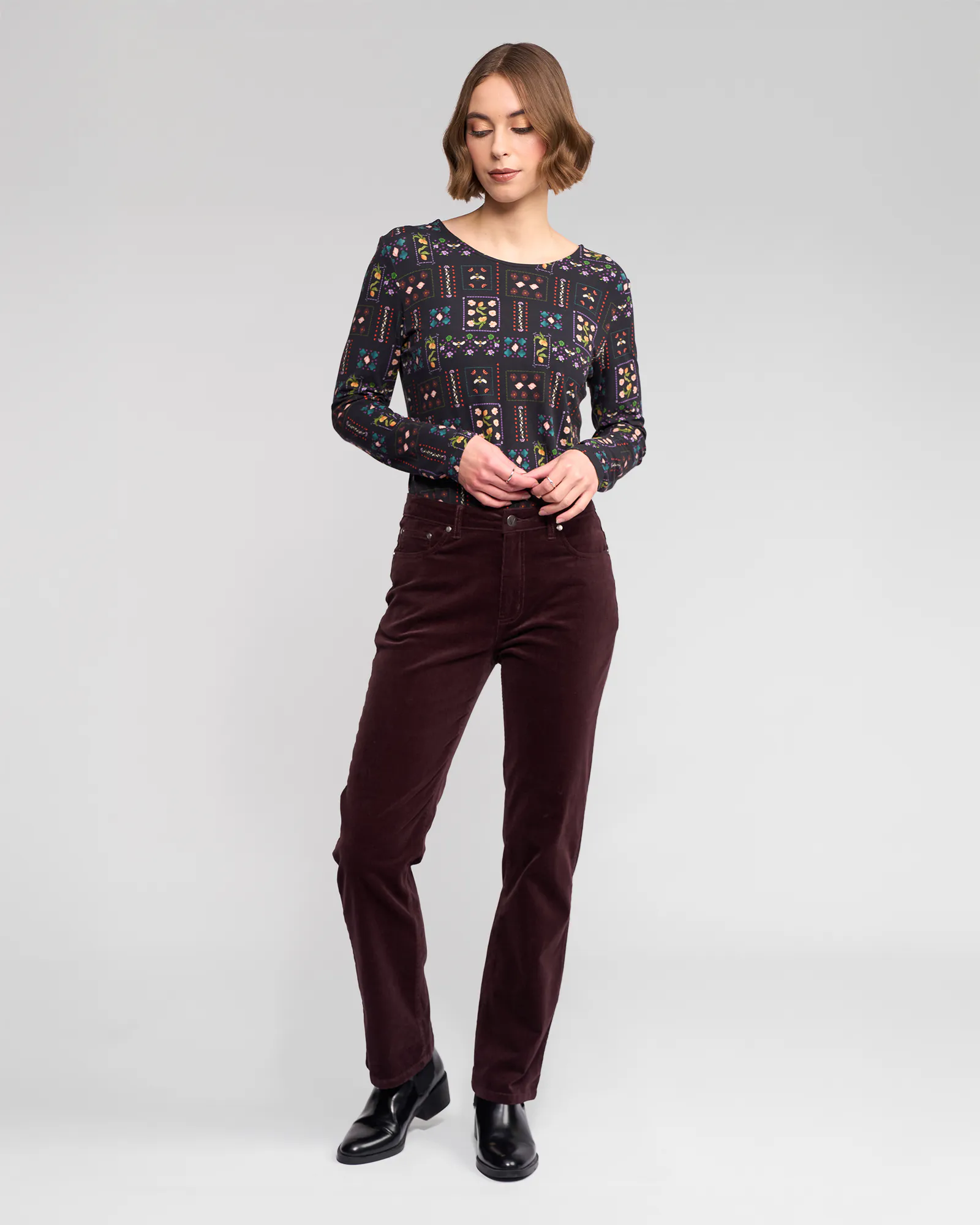 Classic straight-leg full-length pant in stretch pinwale cord, designed in our Merlot shade — a deep maroon red. A timeless style with a clean silhouette, offering comfort, ease, and everyday versatility.