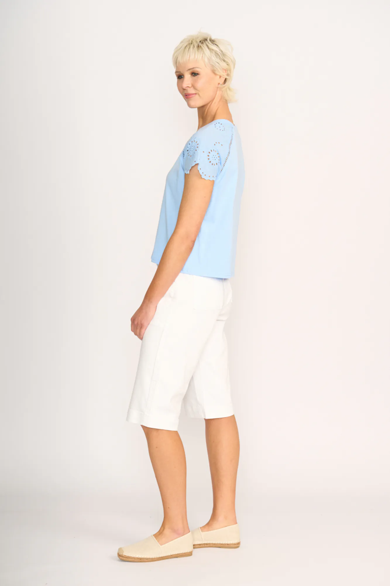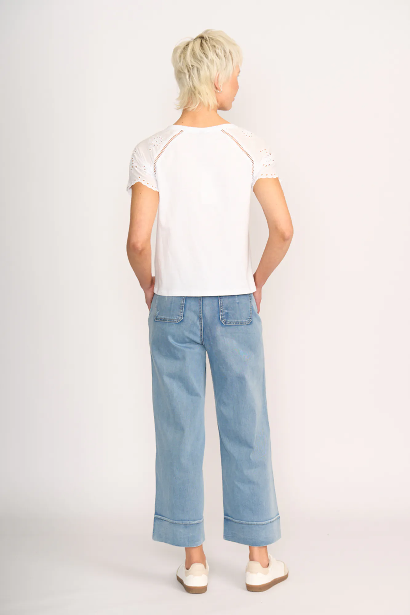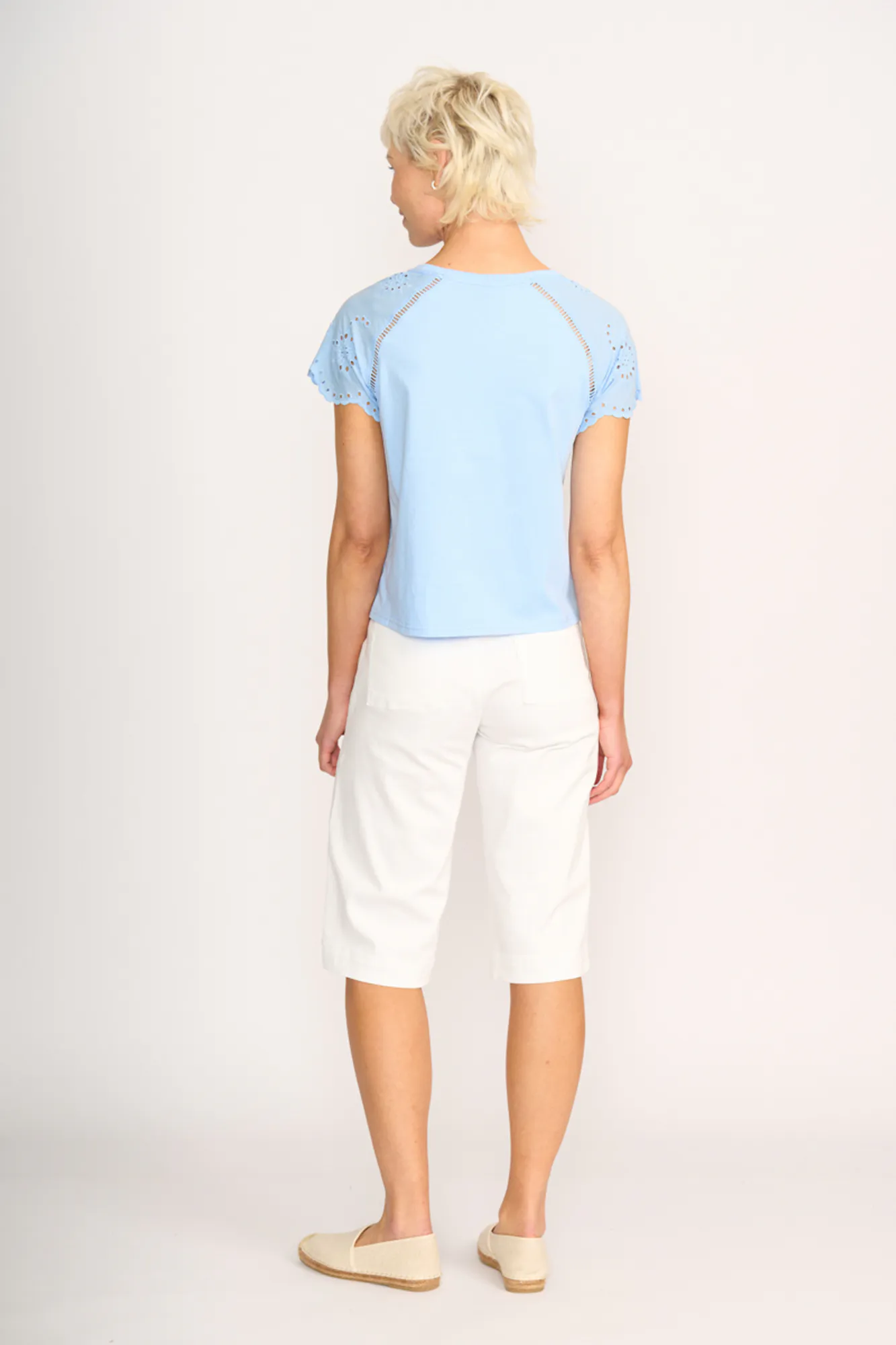 A t-shirt with a difference! Check out the contrast broderie anglaise on the raglan sleeve. Body length taken from the shoulder to the hem is approx. 60cm (size M)