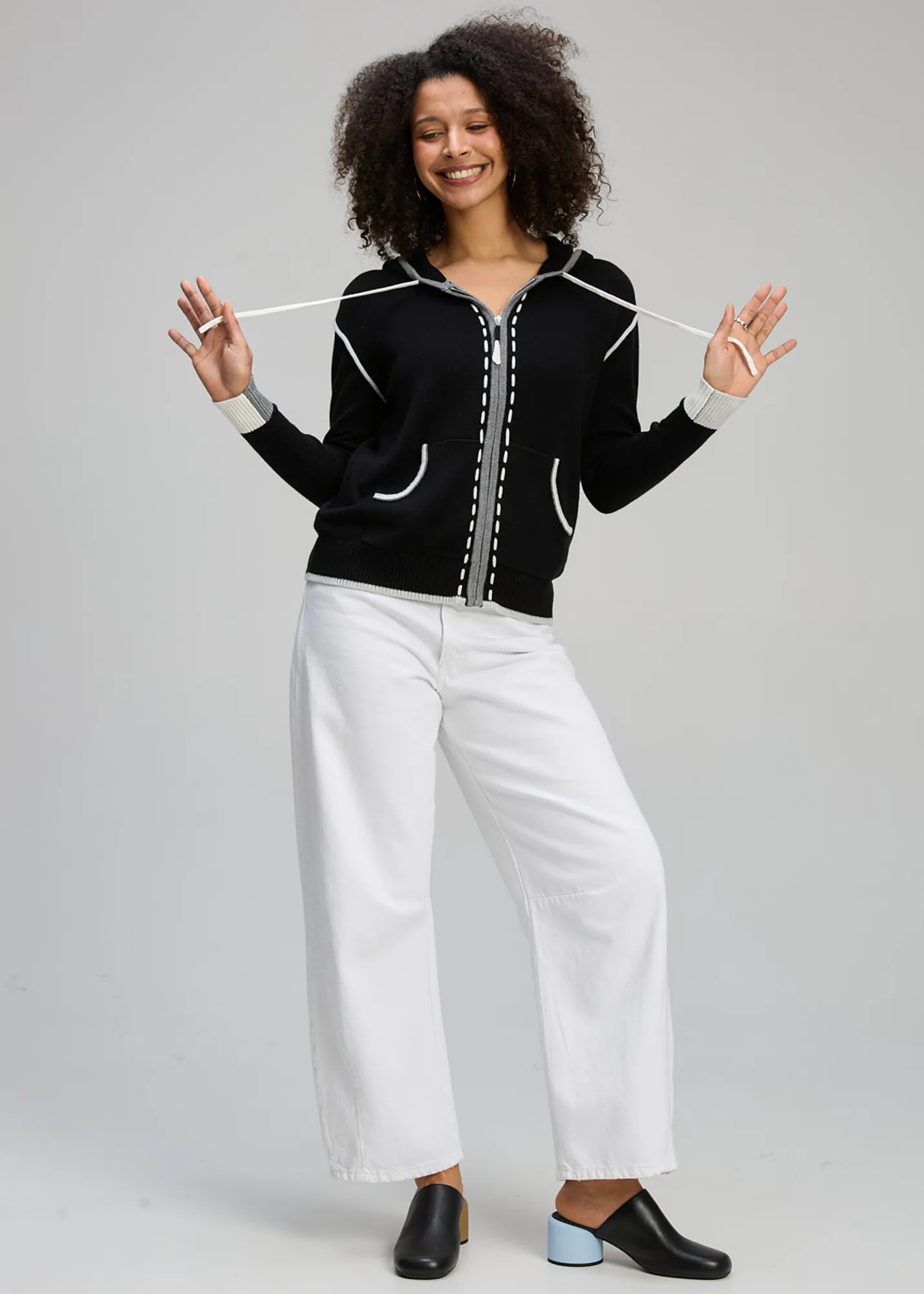 Crafted from a beautifully soft cotton–cashmere blend, it offers breathable warmth with a lightweight feel that’s perfect for layering. The classic black base is elevated with contrasting white stitched trim and matching drawcords, creating a clean, tailored finish. Practical front patch pockets and ribbed cuffs and hem provide structure while maintaining its relaxed appeal.