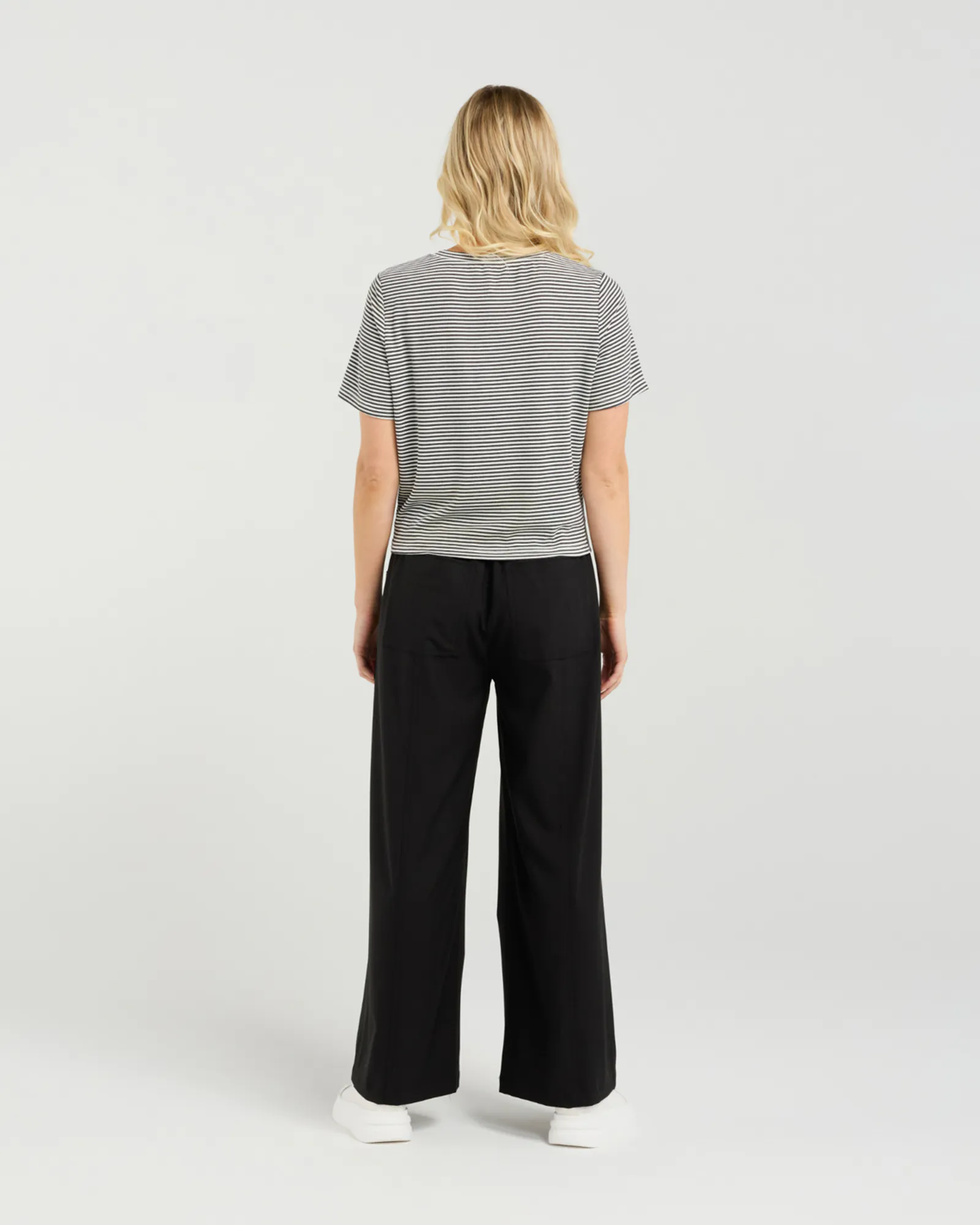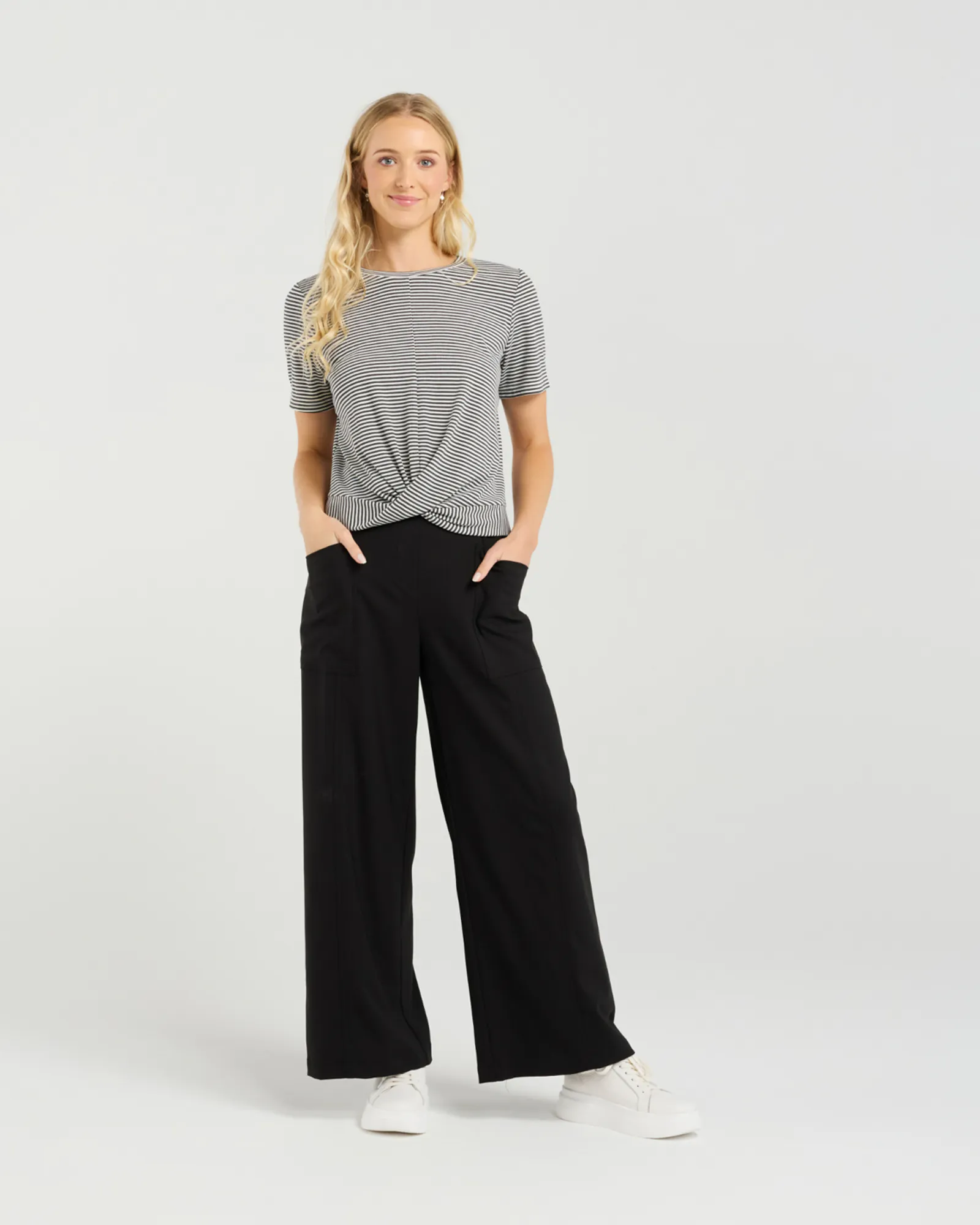 A must-have top for summer, perfect back with denim, high waisted wide leg pants, and trendy midi-skirts. Made out of Cotton blend rib knit and featuring round banded neckline, and a flattering twisted detail on the front, this is sure to become your go-to tee for summer.